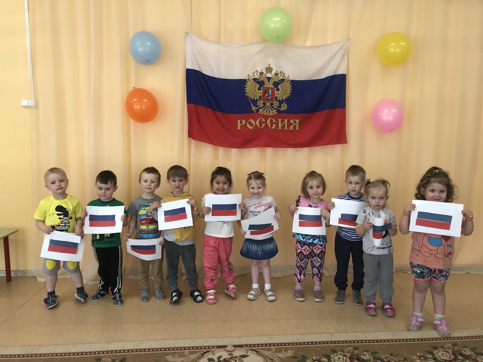 В этот день символами всех мероприятий, проходивших в нашем детском саду , были: флаг, герб и гимн России. На празднике ребята читали стихи о символике нашей страны, о Родине, о родном крае и счастливом детстве. Водили хоровод . В торжественном молчании стояли маленькие граждане России, когда звучал гимн страны. Рисовали флаги и воздушные шары Российского триколора. Дети усвоили, что День России – праздник свободы, гражданского мира и доброго согласия всех людей на основе закона и справедливости.