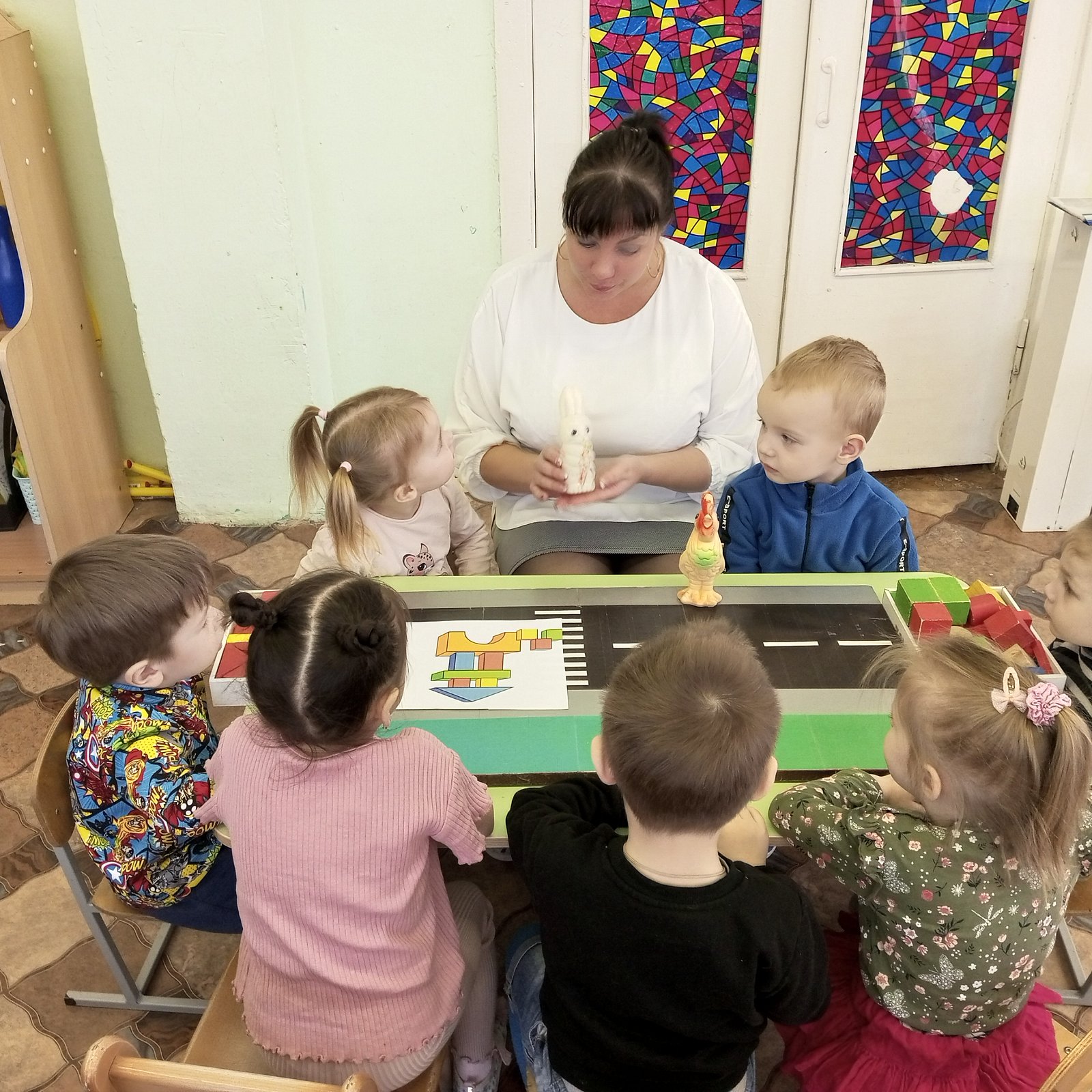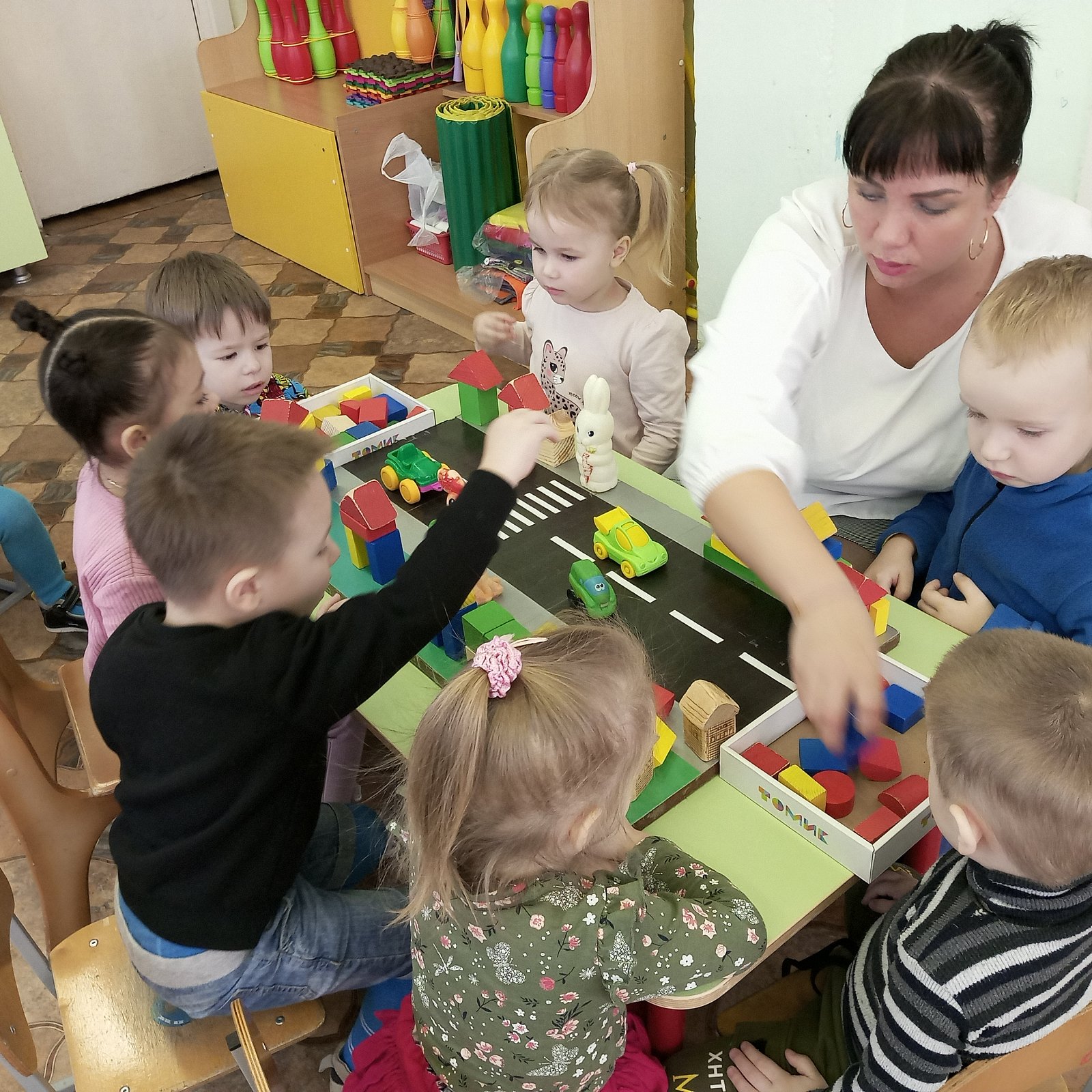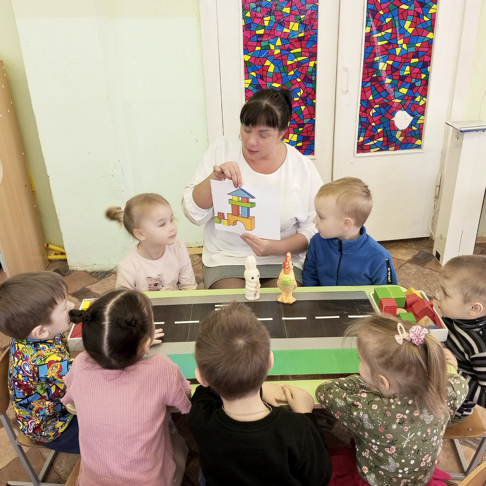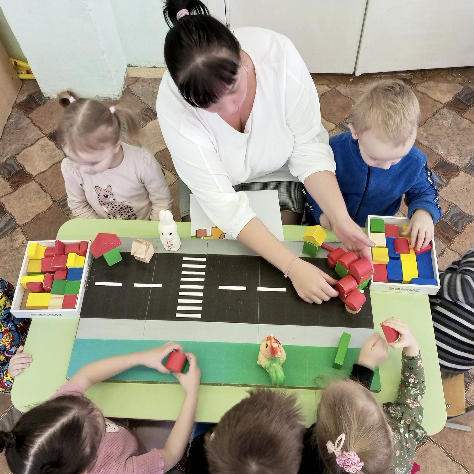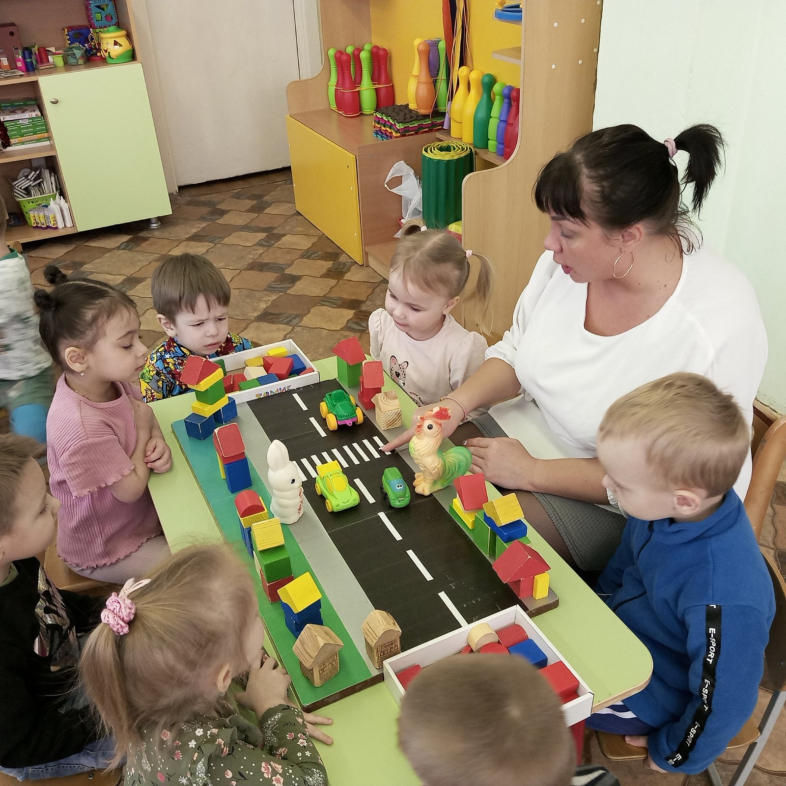 В такой прекрасный солнечный день к ребятам из группы «Солнышко» пришел в гости Зайчик и Петушок. Они просят помощи у ребят. Каждому зверьку нужен свой крепкий домик. Они хотят жить в городских домах. Зайчик рассказал ребятам, что хочет поселиться на другой стороне дороги от петушка. Но сказочные звери не знают, как строить дома и из чего. Ребята очень обрадовались и захотели с огромным удовольствием помочь зайчику и петушку. Они предложили нашим сказочным гостям сделать постройки из конструктора, ведь кубики разнообразны по форме и цвету, по разным сторонам дороги. Ребята повторили со сказочными героями правила дорожного движения. Рассказали, как правильно переходить дорогу по пешеходному переходу, дома получились красивыми и крепкими.