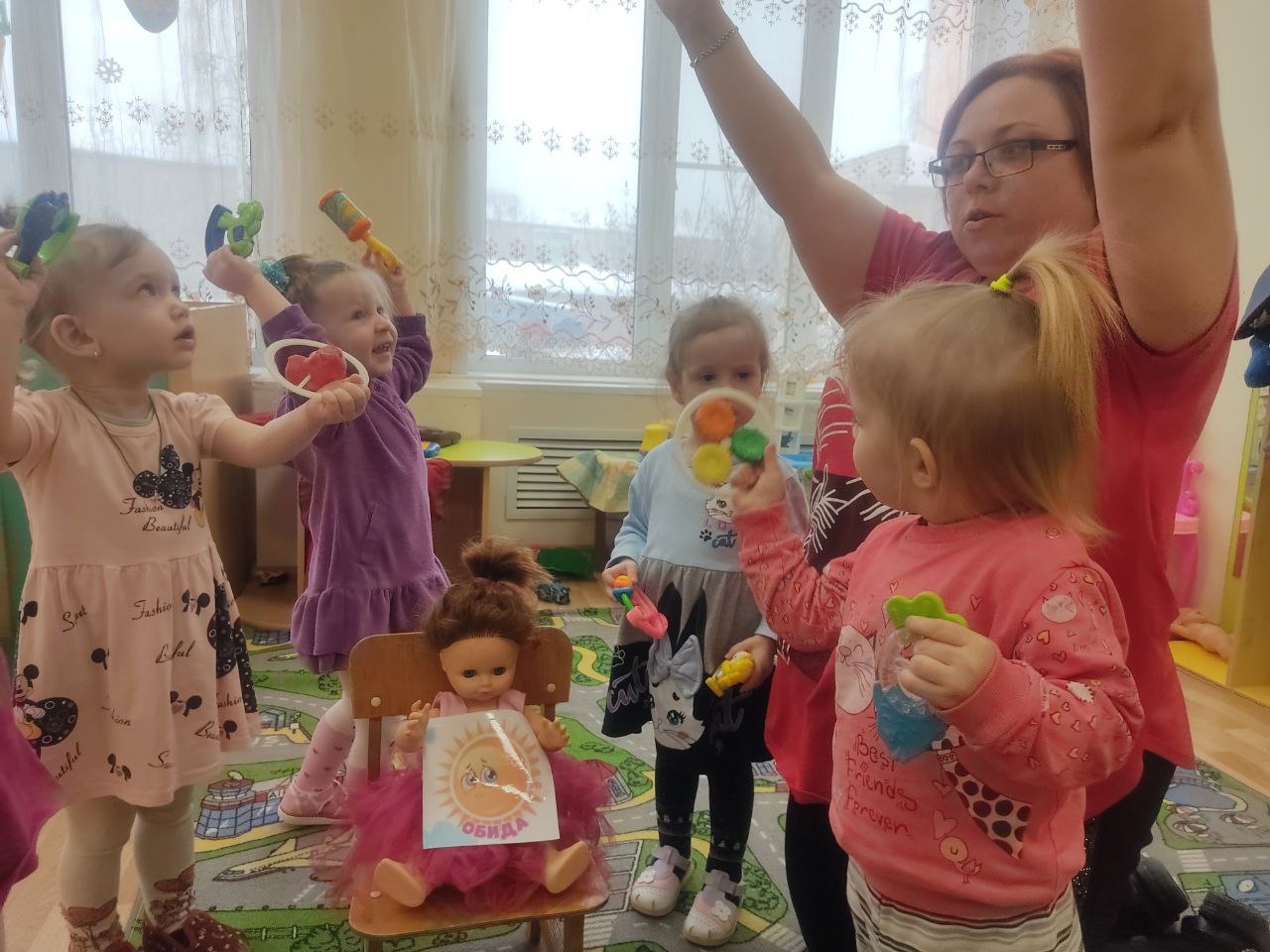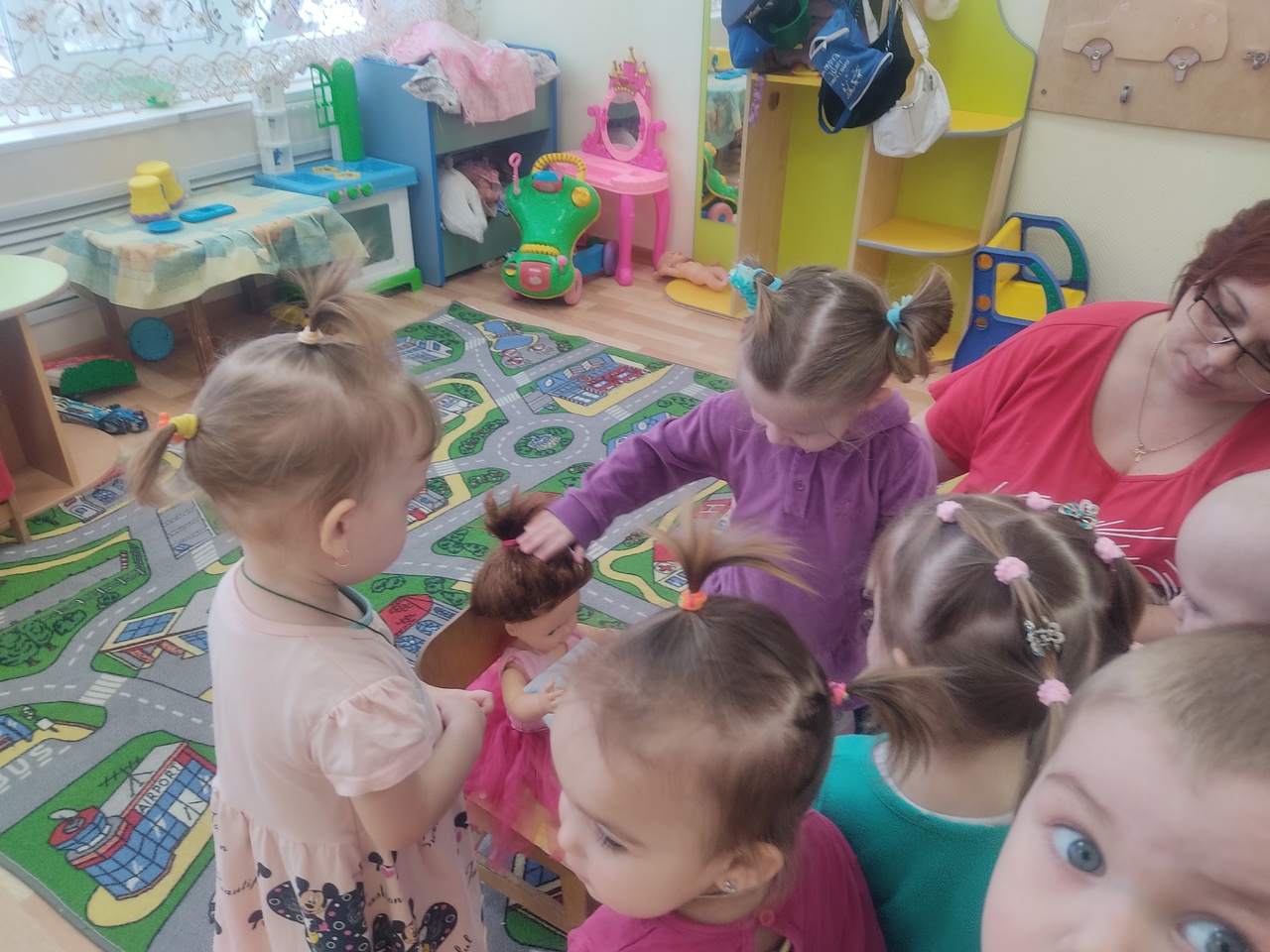 Наши ребятки вместе с воспитателем Анной Евгеньевной реши помочь и успокоить куклу Машу: