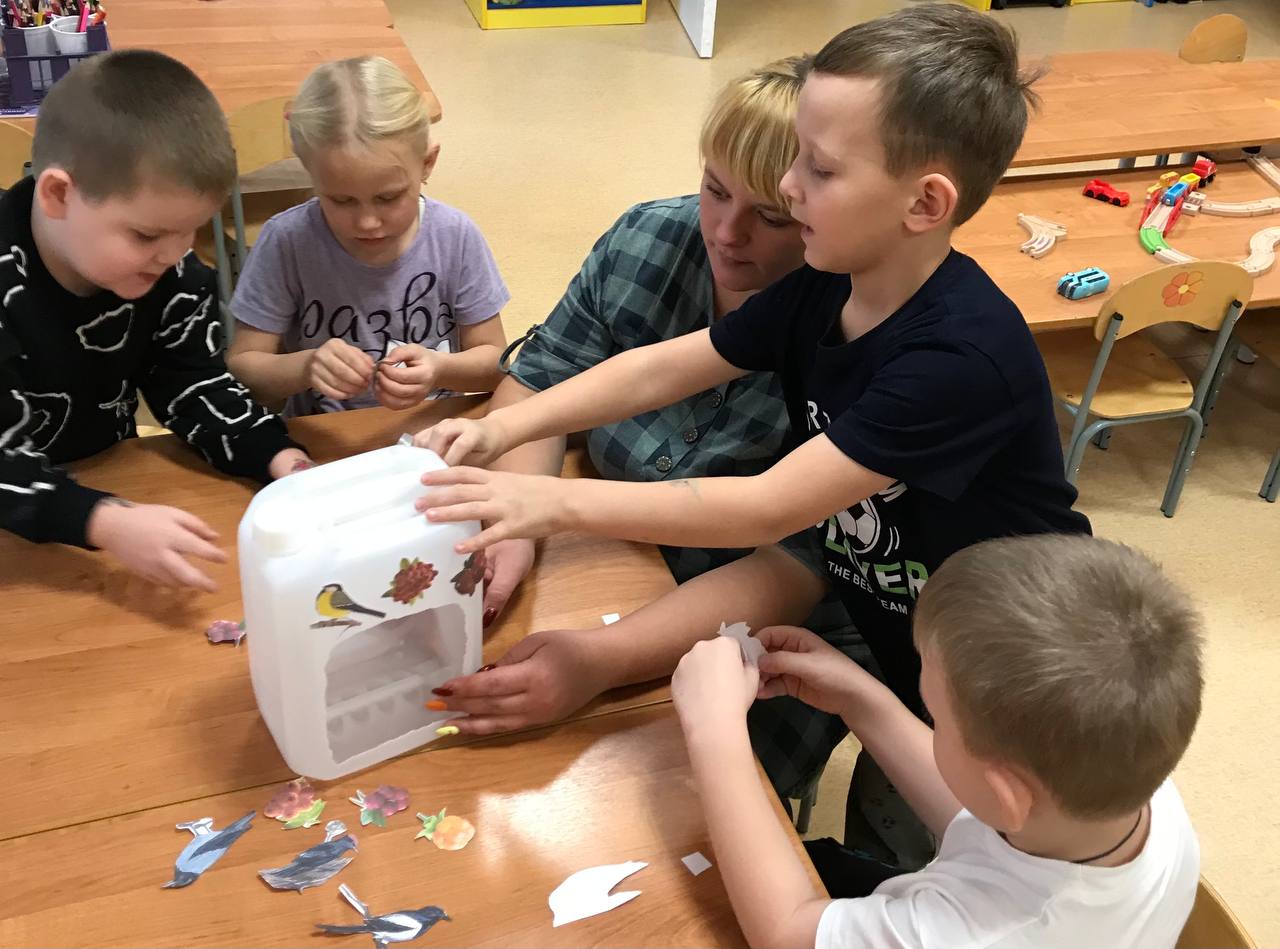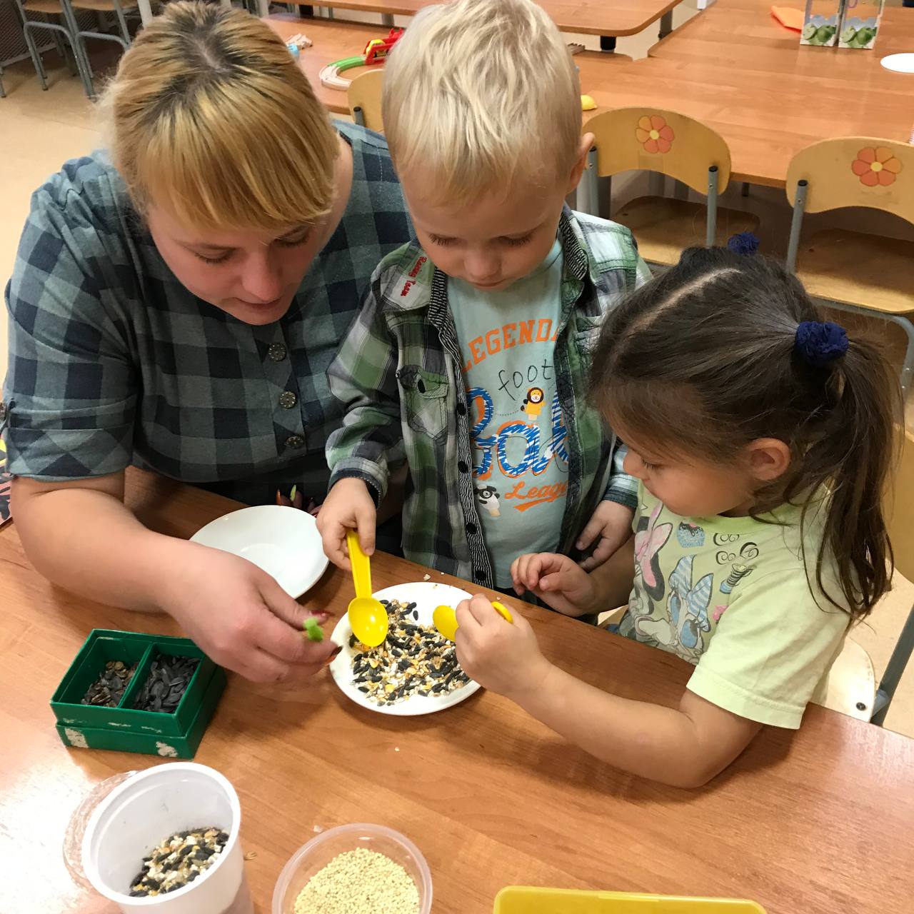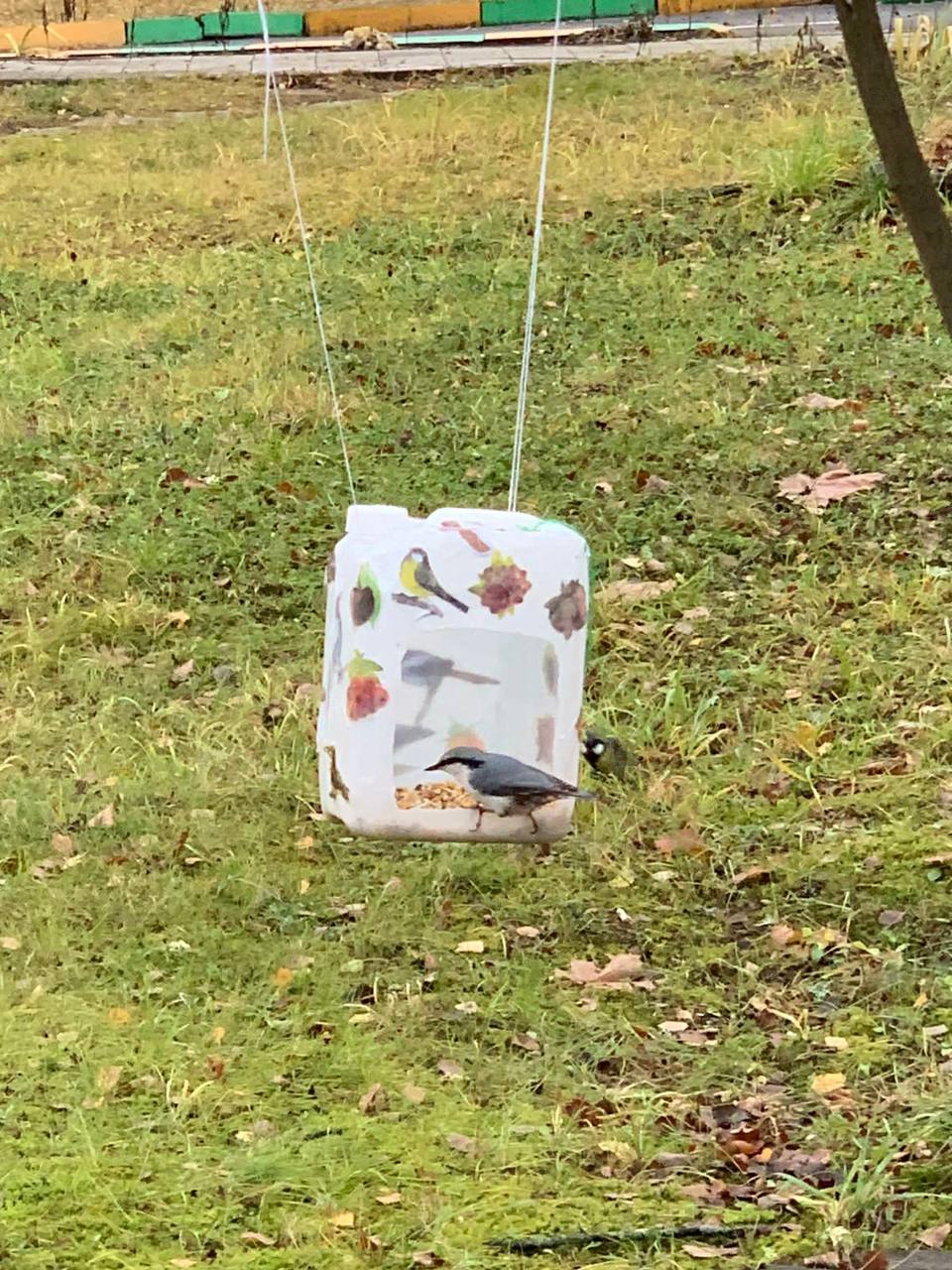 Сегодня воспитанники группы "Алёнушка" познакомилась с птицами нашего города, узнали, чем они питаются, рассмотрели содержимое корма. В ходе беседы выяснили, с какой проблемой столкнулись птички в осенние холода и дождливую погоду. Ребятам стало жалко пернатых друзей и они решили сделать кормушки для птиц. Вместе с воспитателем группы Горбунцовой Е.П. рассмотрели из чего можно сделать кормушки, собрали все необходимое и уже совсем скоро появился подарок для птиц. Ребята с удовольствием повесили кормушки на свободном участке детского сада и теперь проверяют их и досыпают корм. Детям очень нравится наблюдать как птички прилетают в кормушки и клюют зёрнышки. К ним даже прилетел редкий вид «Серый поползень». После этой проделанной работы ребята сделали коллективную аппликацию «Кормушки для пернатых друзей».(Горбунцова Е.П.)