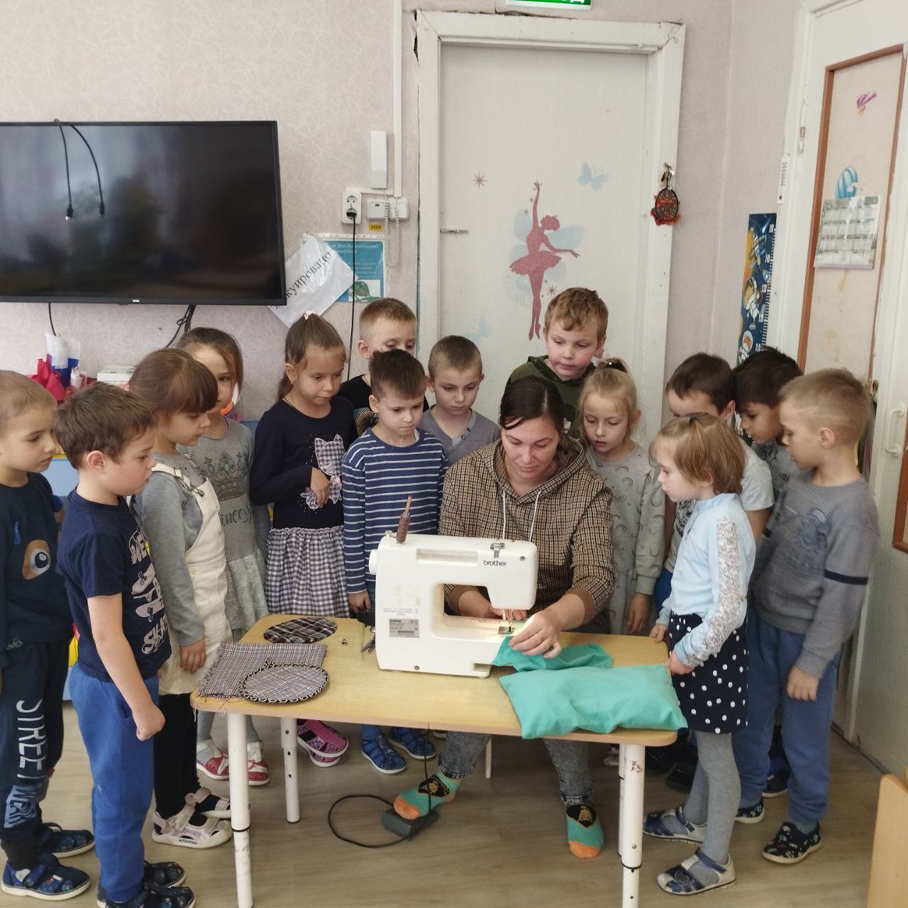 - а к ребятам группы "Мотылёк" пришла мама Давыдова И.А. с техникой рисования ватными палочками "Цветы в технике Незантизм", Зубкова С. В. познакомила ребят со швейной машинкой;
