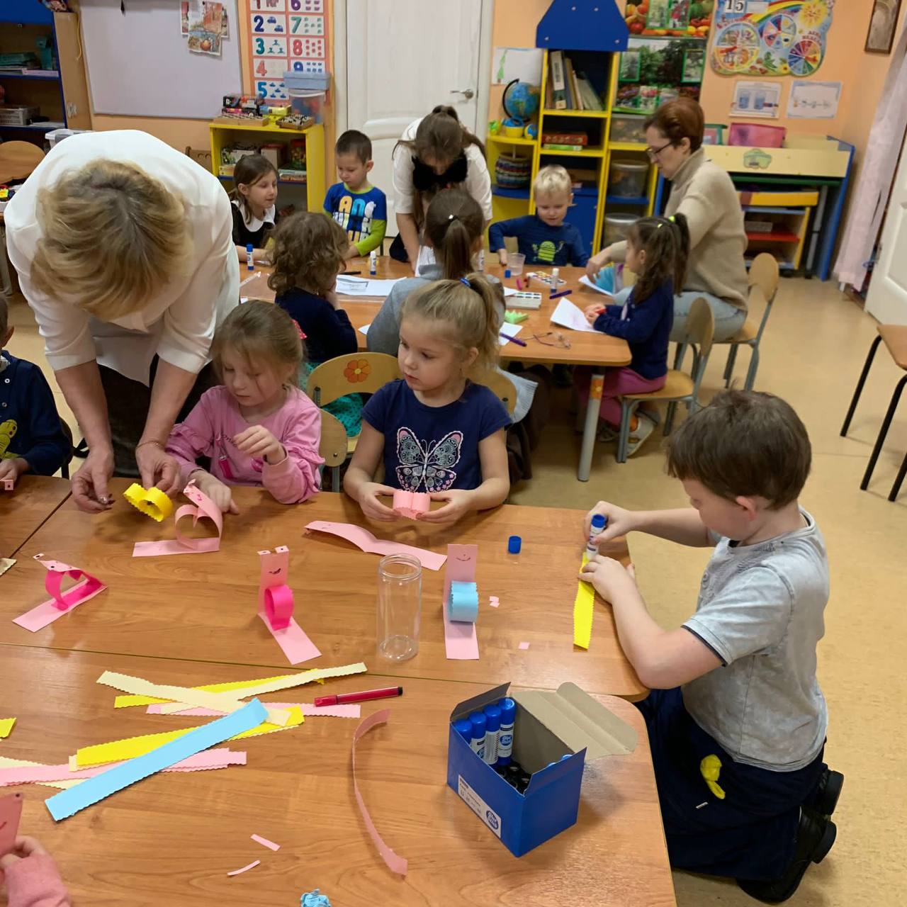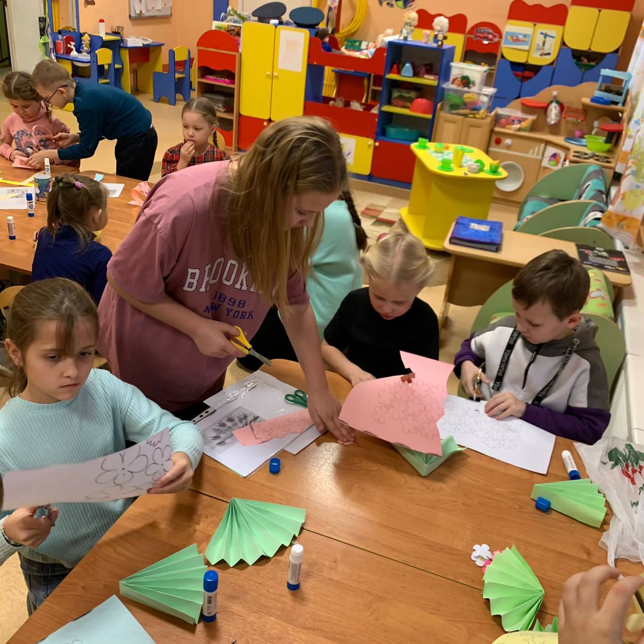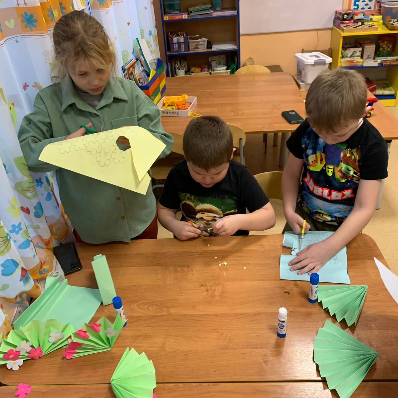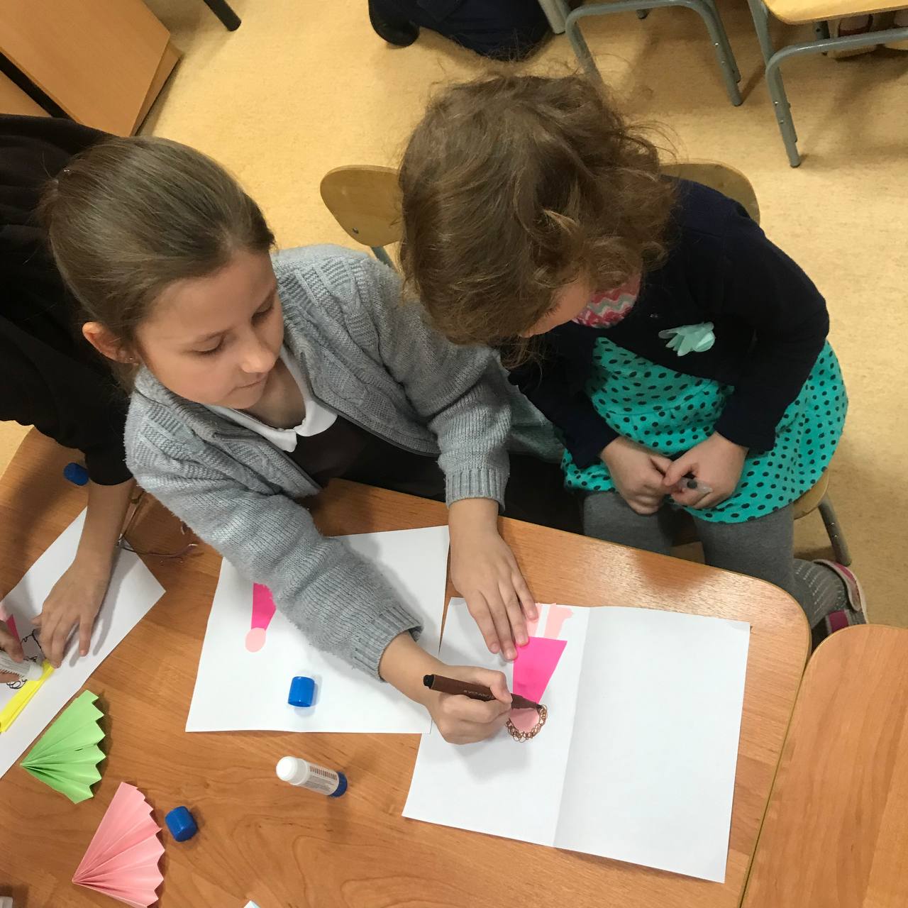 В группе «Алёнушка» учащиеся 3 «а» класса из МБОУ СОШ 1 провели мастер класс на тему «Открытка для мамы». Из воспитанников сформировали 3 группы, каждая из которой выполняли своё задание:
