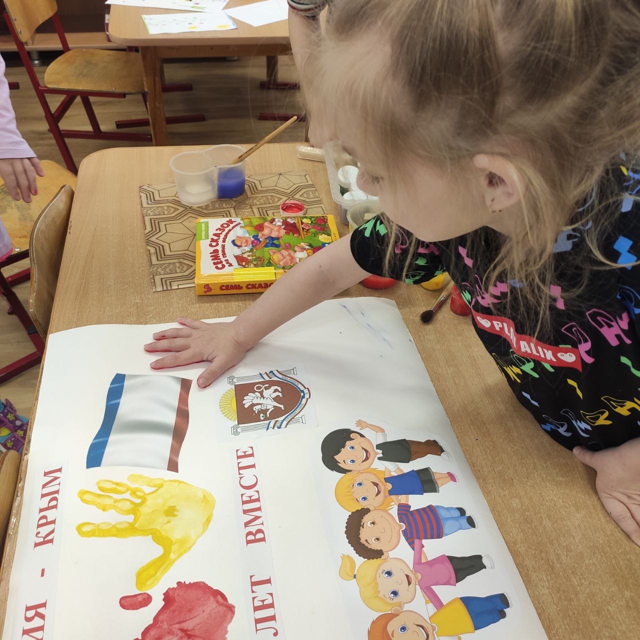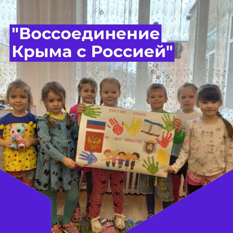 С целью формирования у детей патриотических чувств, уважения к истории своей страны, развития интереса к историческим событиям, произошедшим в Крыму 18 марта 2014 года. В группе "Ладушки" прошло мероприятие посвященное Дню воссоединения Крыма с Россией. Ребята с интересом слушали рассказ об истории Крыма, о достопримечательностях и природе полуострова. Дети познакомились с символикой Крыма, изучали флаг и герб. Просмотрели презентацию-мультфильм московского образования "Удивительный полуостров Крым".Совместно с воспитателем выполнили коллективную работу "Россия и Крым - 10 лет вместе". Наши ребята получили массу интересной и полезной информации, положительные эмоции и яркие впечатления.