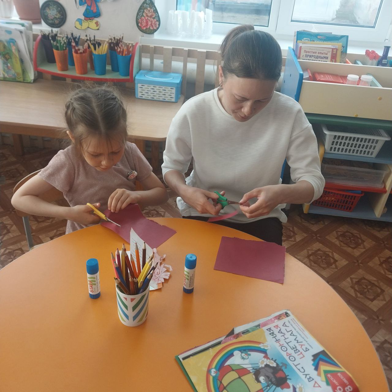 В преддверии Всемирного дня библиотек, в нашем детском саду, в группе "Ромашка" ребята совместно с воспитателем и родителями провели мероприятие "Новая книжка", где своими руками ребята изготовили книжки - малышки для детей ясельной группы.