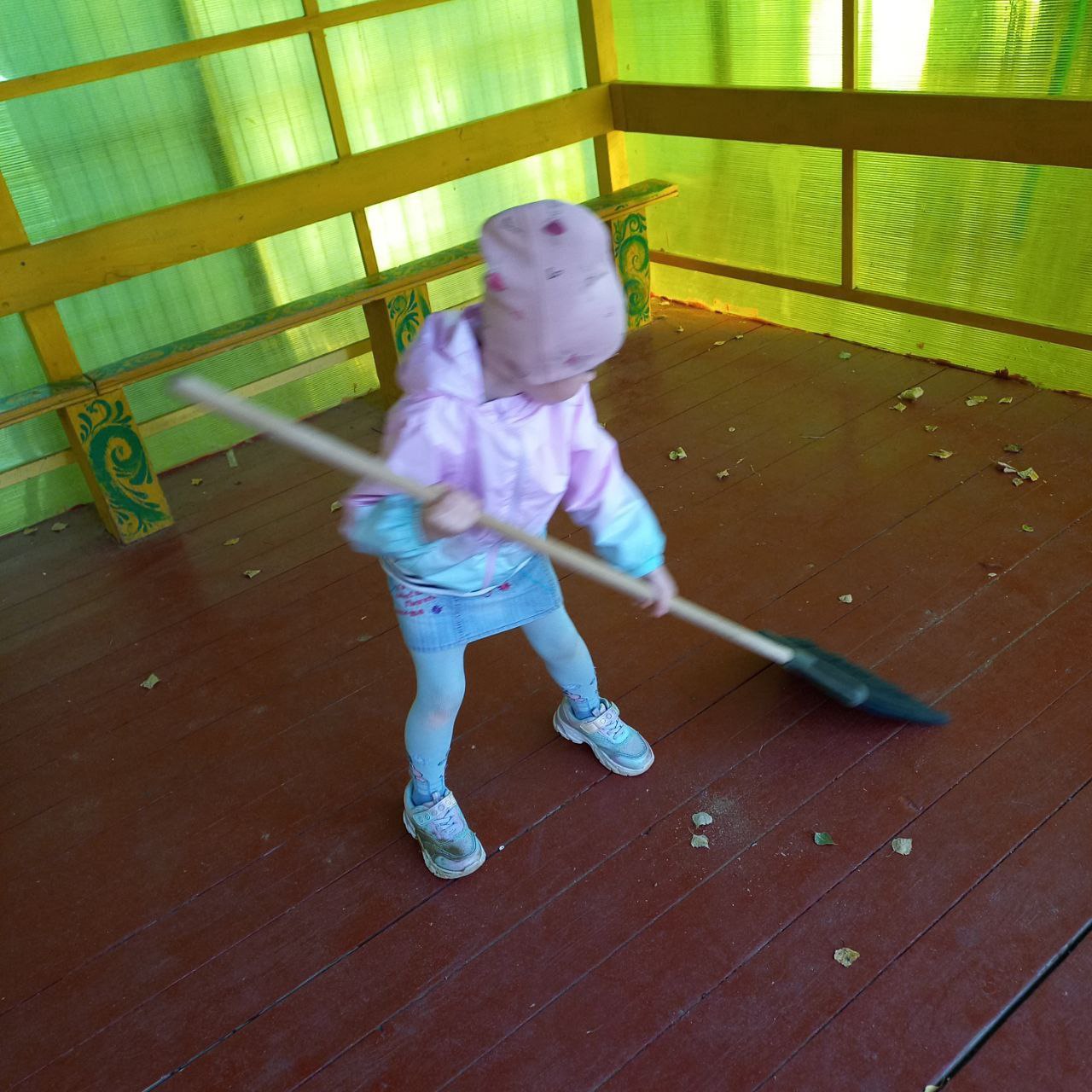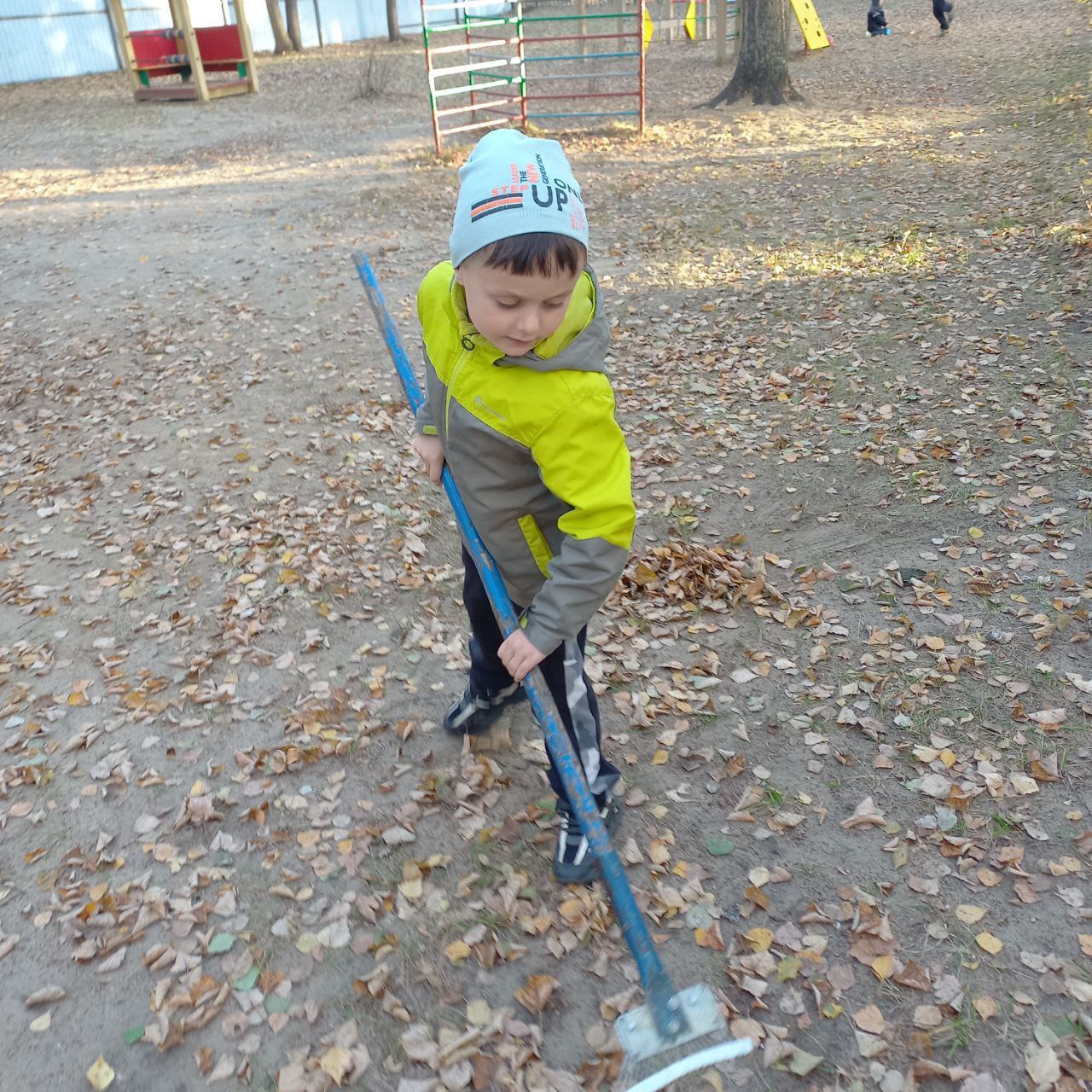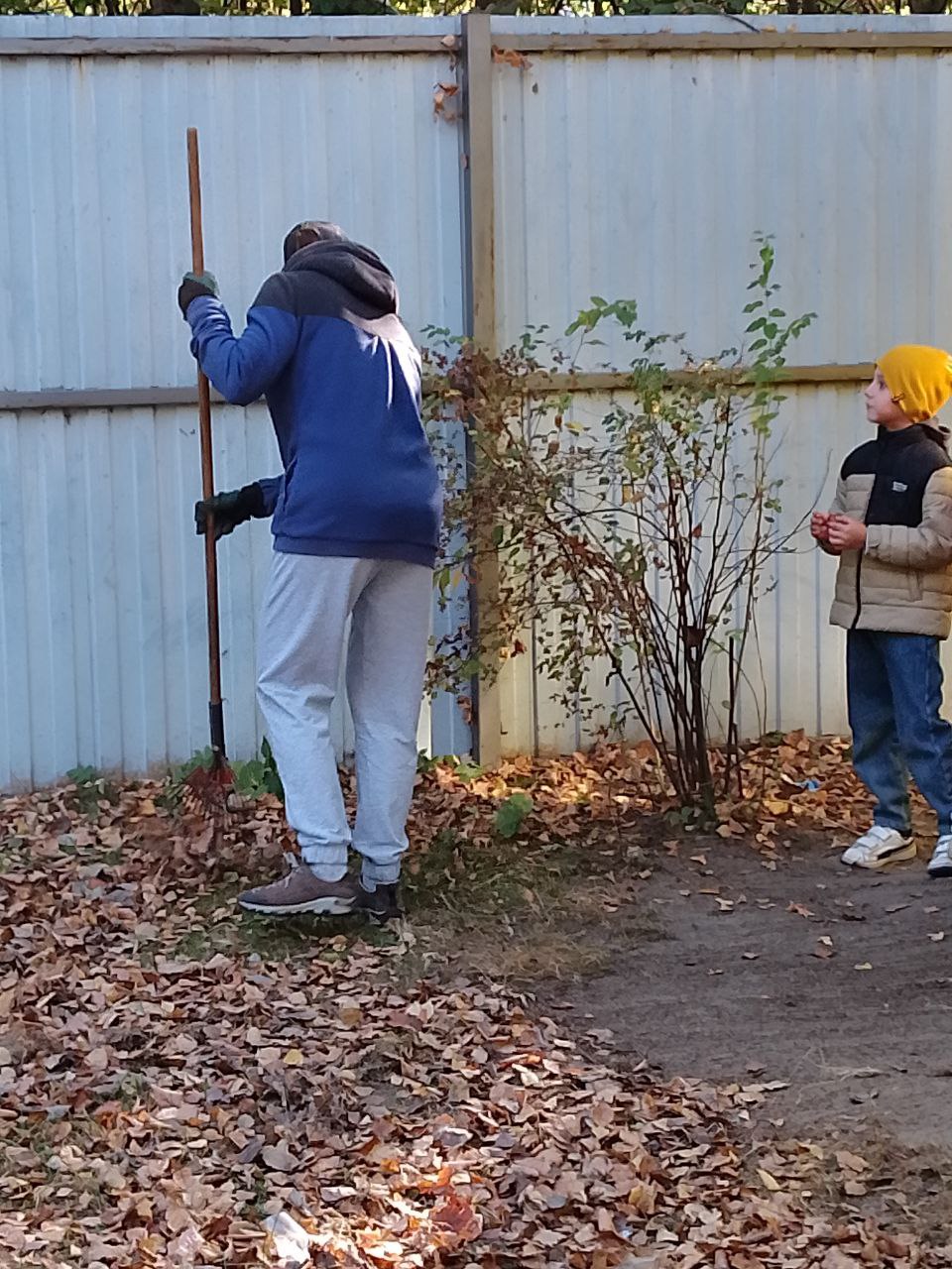 Все дружно,вооружившись необходимым инвентарём,вышли на уборку территории.