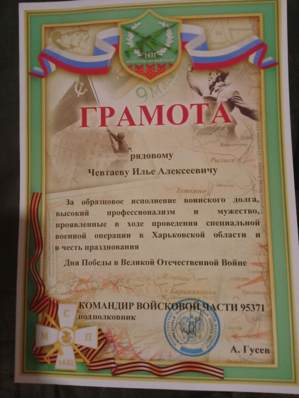 Илья Алексеевич Чевтаев-в ноябре 2023 года подписал контракт, после месяца обучения в Курской области в военно-полевой части переправили охранять границу под Белгородской областью. А перед новым 2024 годом отправили проходить службу уже в Харьковскую область в пулеметный полк. В апреле 2024 года при выполнении боевого задания около населенного пункта Першетравня получил осколочные ранения, попал в госпиталь, а после госпиталя вновь вернулся на фонт дальше исполнять воинский долг.