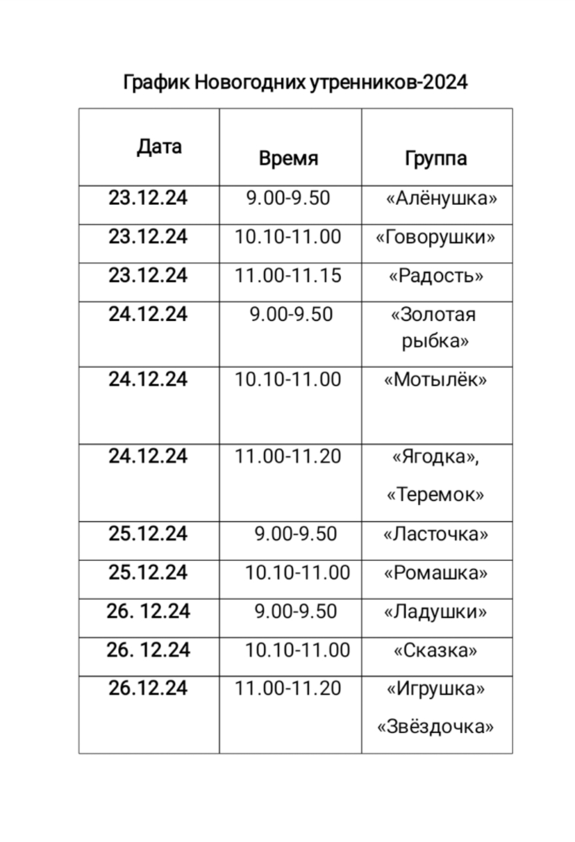 В 2024 году Новогодние утренники будут проходить по следующему графику: