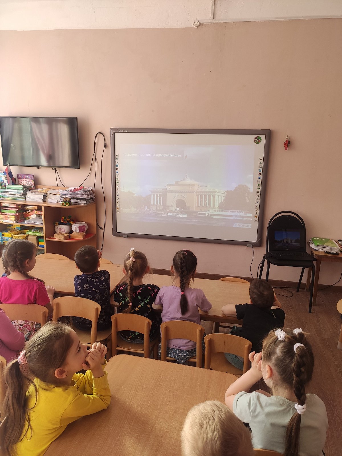 "Санкт-Петербург - северная столица России". Ребята познакомились с историей города, узнали, что его основателем был Петр I, ему был поставлен памятник, который называется "Медный всадник".Совершили виртуальную экскурсию по знаменитым и самым красивым местам Санкт- Петербурга: Эрмитаж, Петропавловская крепость, Петергоф, Исаакиевский собор, Сенатская площадь и многое другое. А ещё ребята узнали, что в Санкт- Петербурге много рек, каналов, мостов. Особенно Петербург знаменит своими разводными мостами. При основании города, Петр I приказал построить адмиралтейство, здесь родился русский флот. Неделя знакомства с Санкт- Петербургом была насыщенной, интересной и увлекательной. (Воспитатель-Скуднова Т.Н.)
