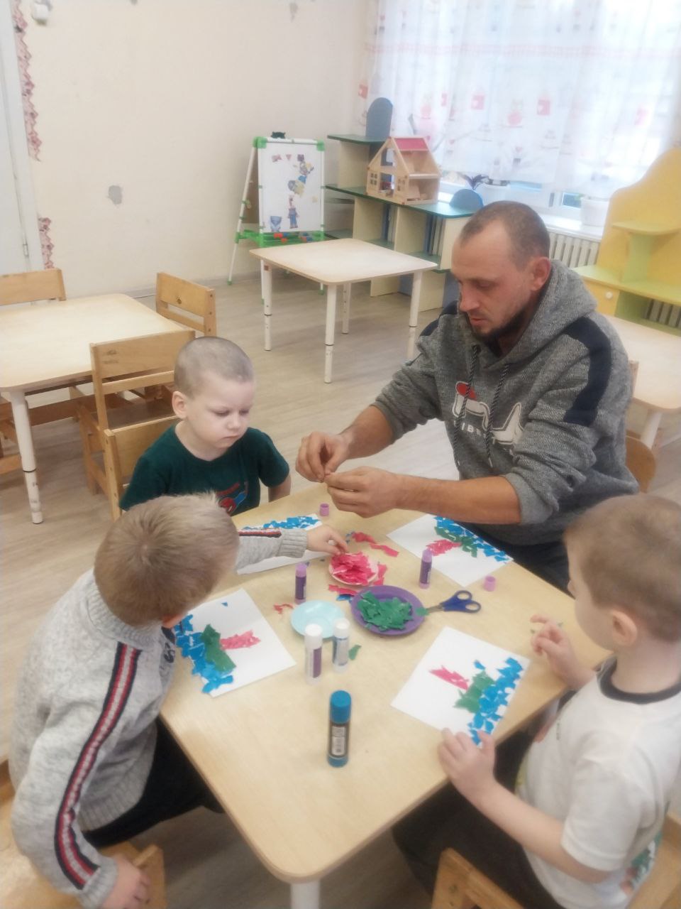В преддверии праздника - Дня отца в группе "Золотая рыбка" прошел мастер-класс от папы Терентьева Виктора Владимировича для ребят в технике обрывной аппликации. Он показал детям как сделать поздравительную открытку.