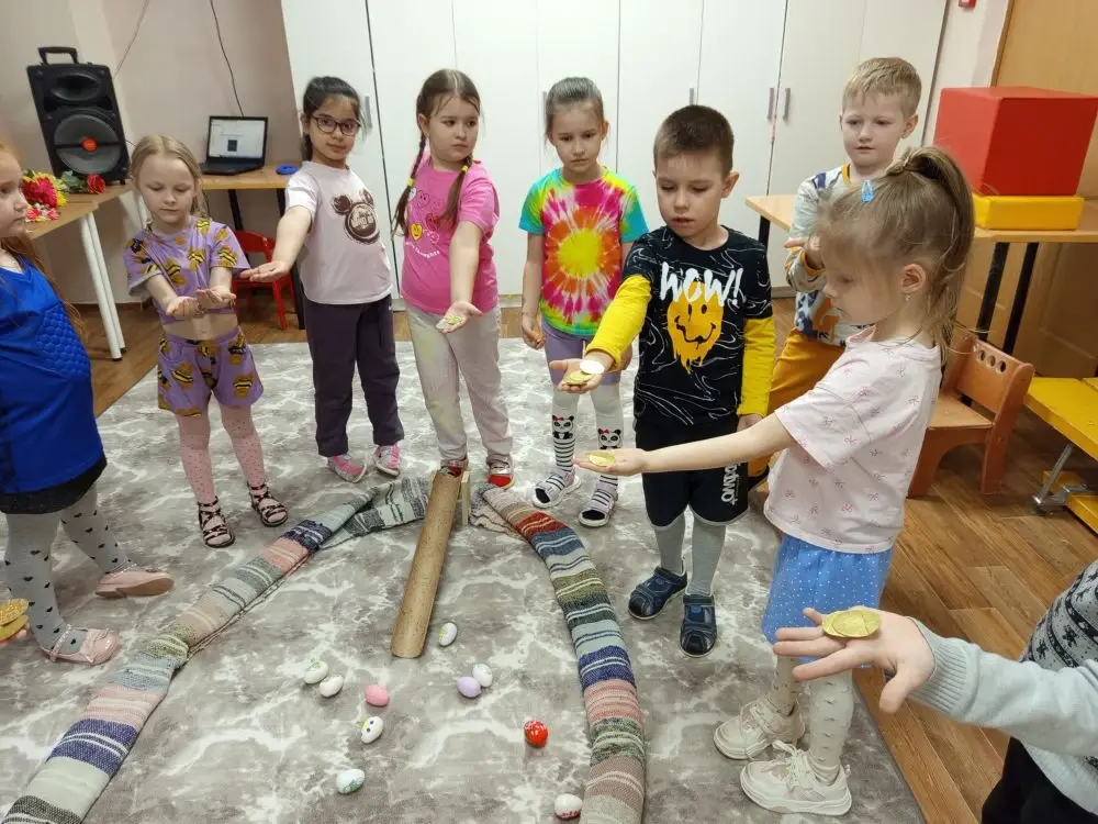 Ребята по очереди скатывали яйца с горки и чьи яички сталкиваются, те дети обменивались фишками разного цвета.
