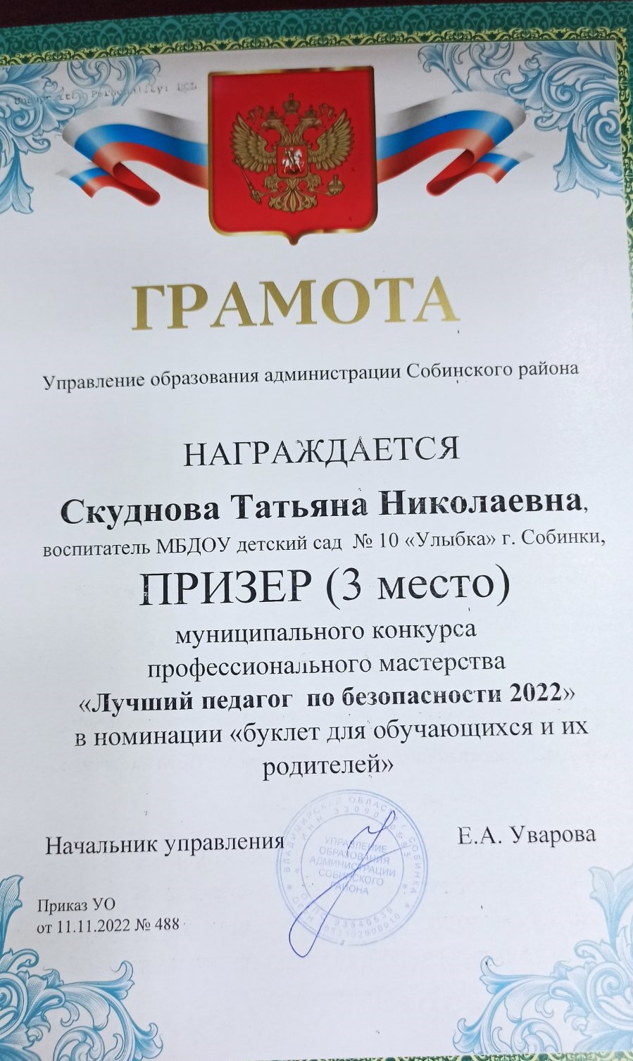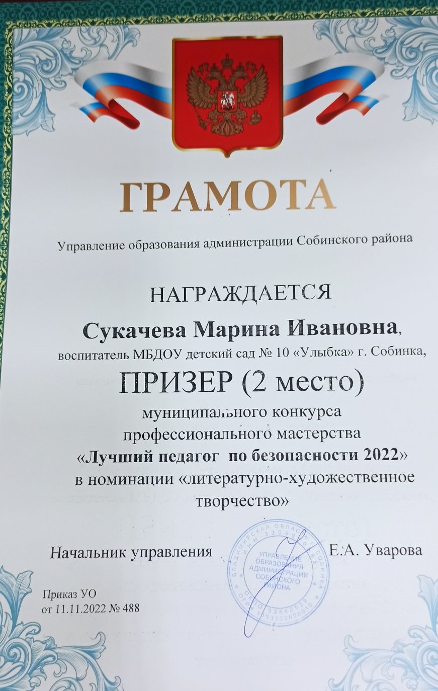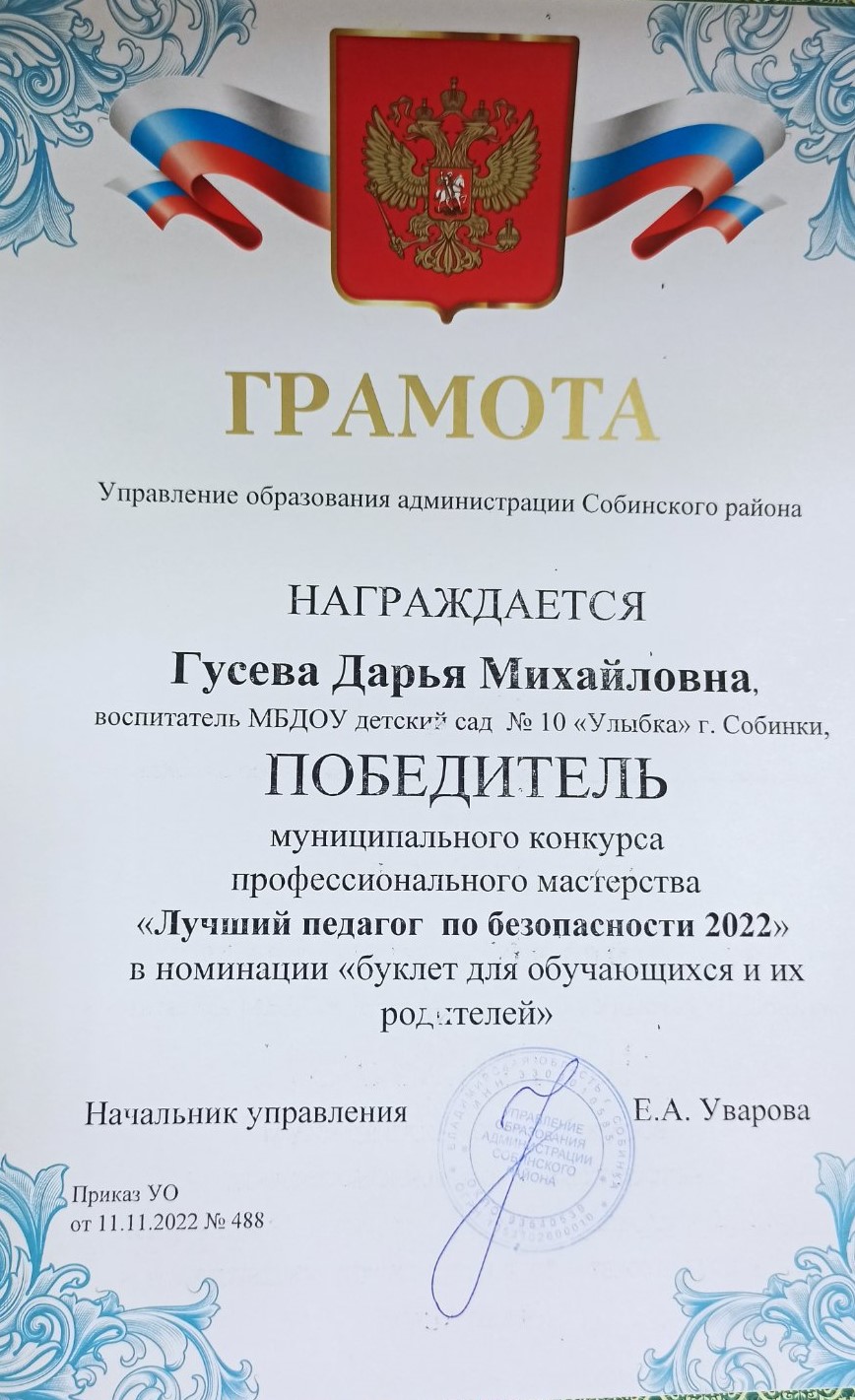 МБДОУ детский сад №10 «Улыбка» выдвигал на конкурс «Лучший педагог по безопасности 2022» 6 человек - победителей внутреннего этапа: 5 педагогов в номинации «буклет для обучающихся и их родителей» и 2 педагога в номинации «литературно-художественное творчество».