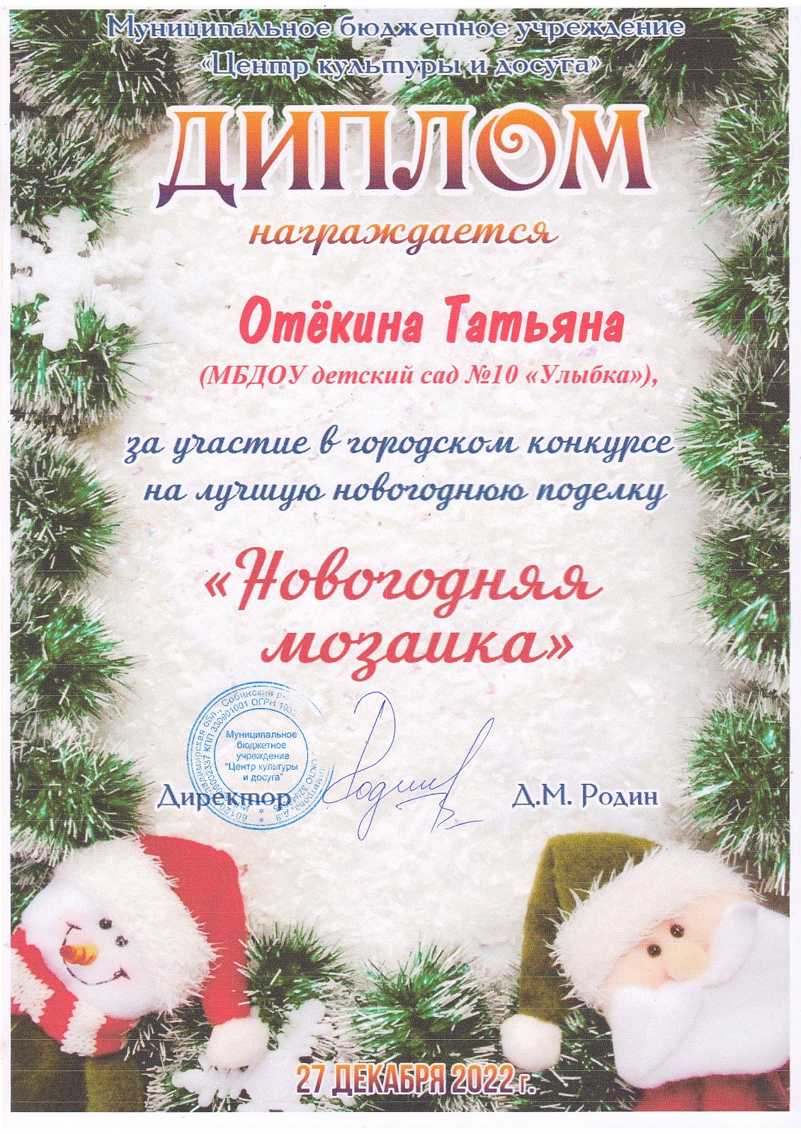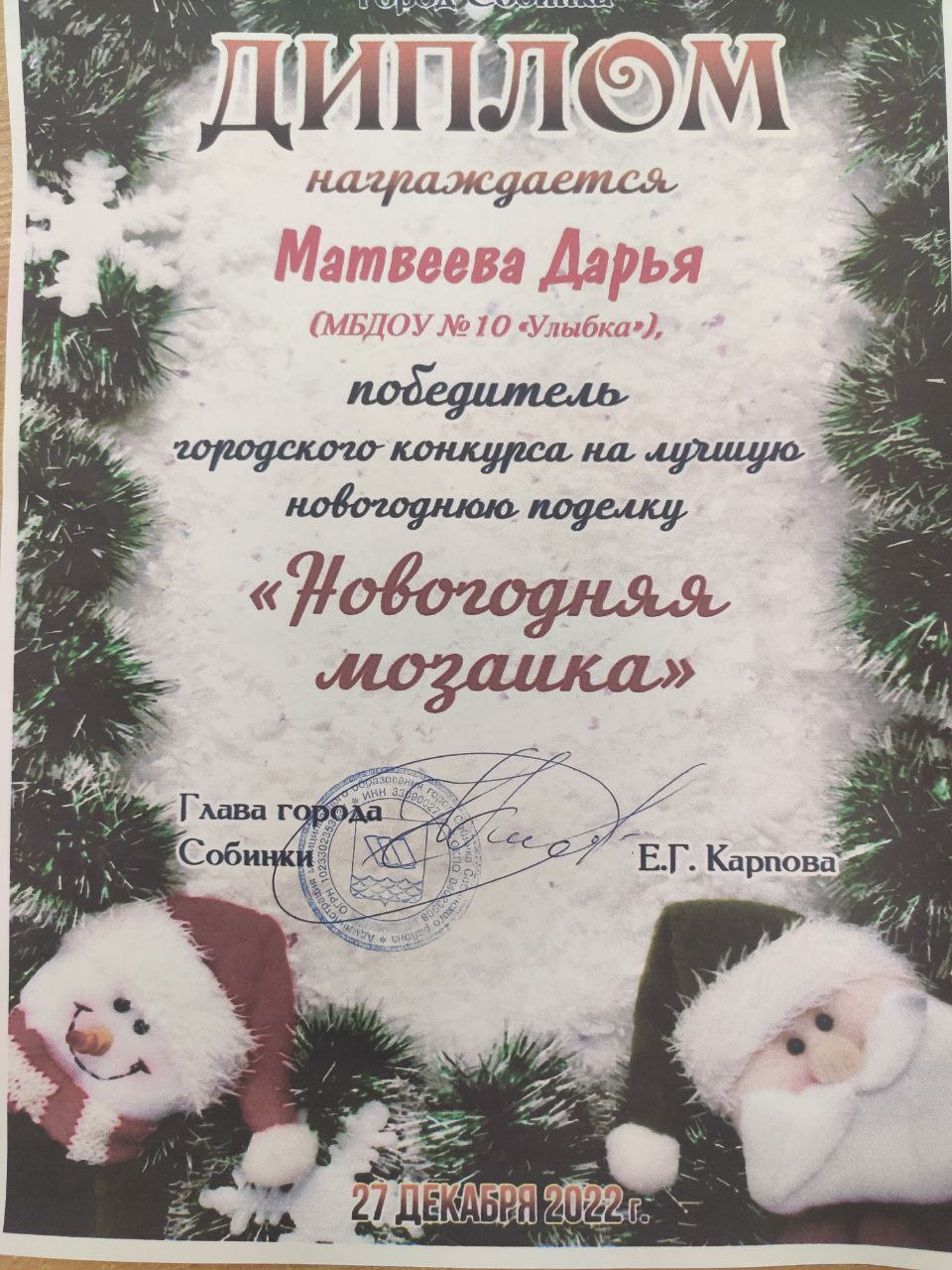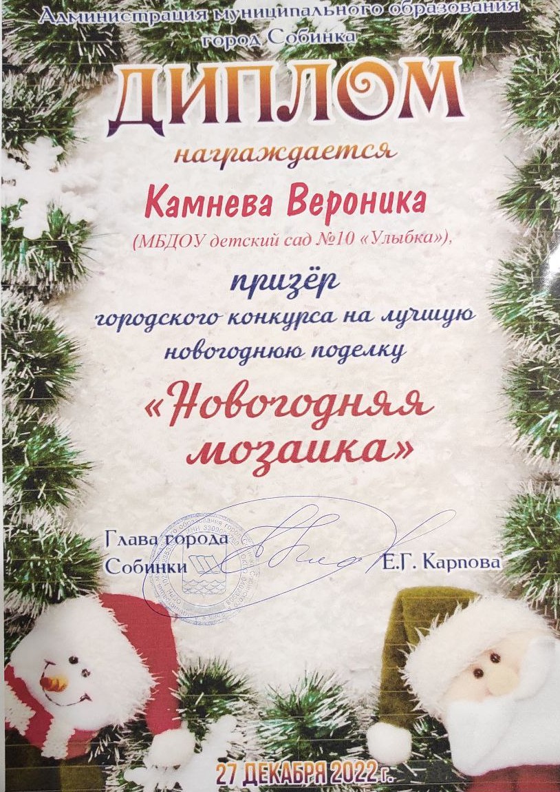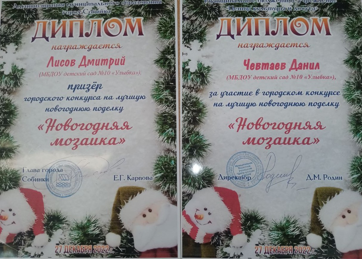 27 декабря в праздничной обстановке все участники были отмечены дипломами, а победители и призеры получили сладкие призы от администраций города Собинки и Дома культуры. Заслуженные награды детям и взрослым вручили заместитель главы города по социальным вопросам Е.Н. Канайлова и директор МБУ «ЦКД» Д.М. Родин.