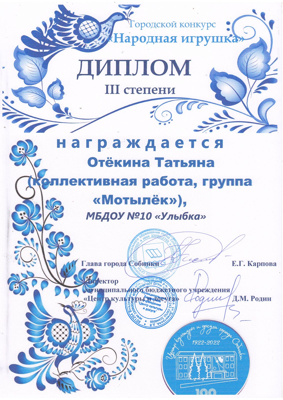 | Мотылек | коллективная работа | Призер, диплом 3 степени | Отекина Т.Е. |