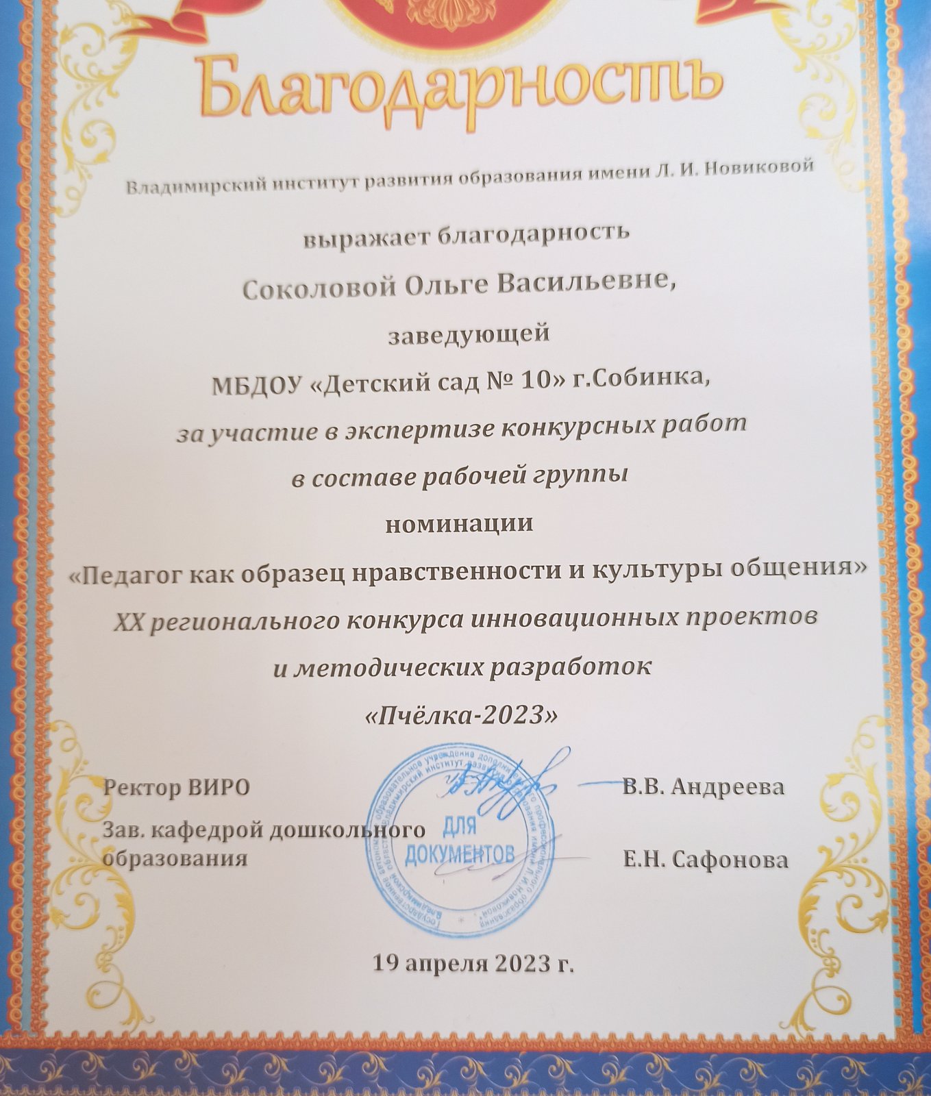 19 апреля в Владимирском институте развития образования прошло грандиозное событие в жизни дошкольных образовательных организаций: были подведены итоги областного конкурса методических разработок "Пчелка" на фестивале мастерства, активности и креативности «Фейерверк творческого полёта «Пчёлка»