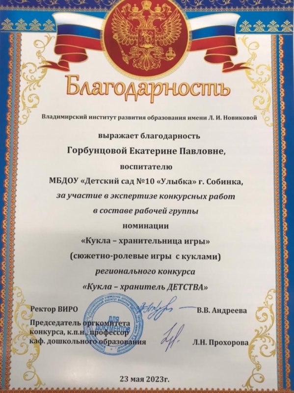 Екатерина Павловна отмечена благодарностью Владимирский институт развития образования за участие в экспертизе конкурсных работ регионального конкурса "Кукла - хранитель детства" Кукла-хранитель Детства