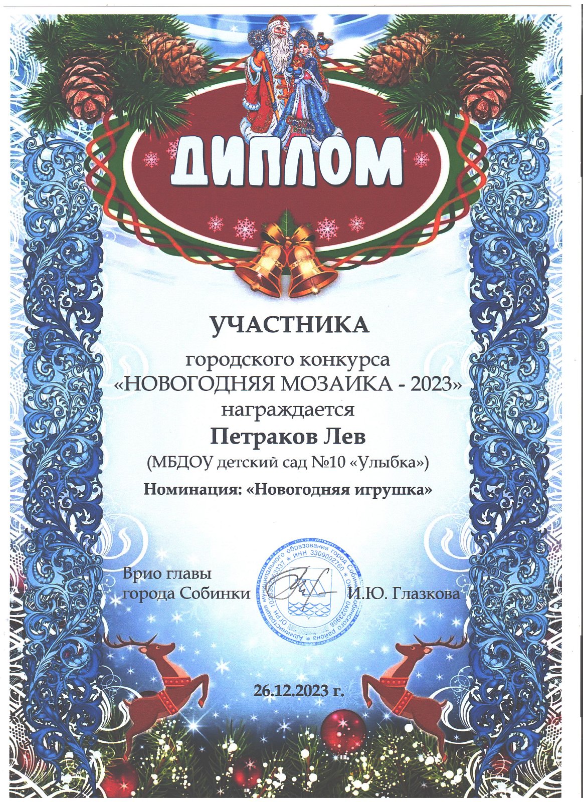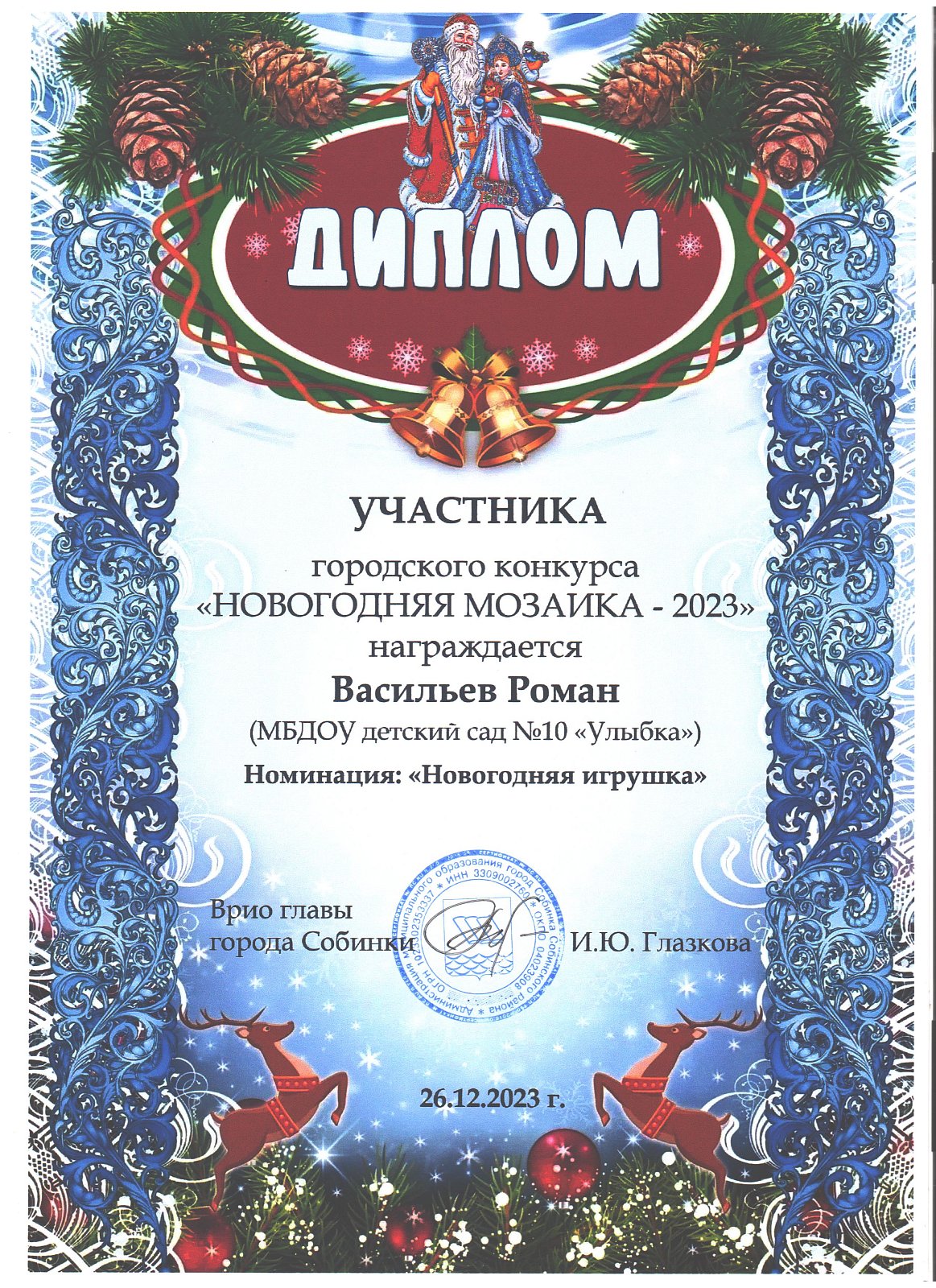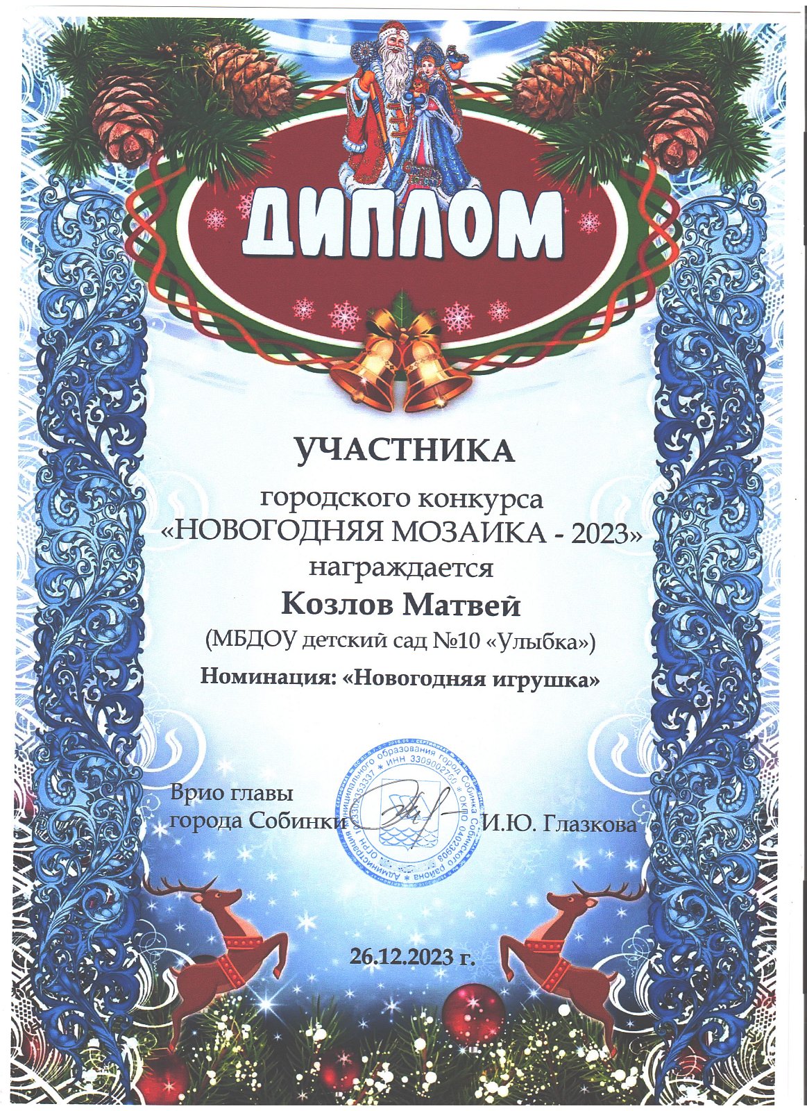 | Игрушка | Козлов Матвей | диплом участника в номинации "Новогодняя игрушка" |