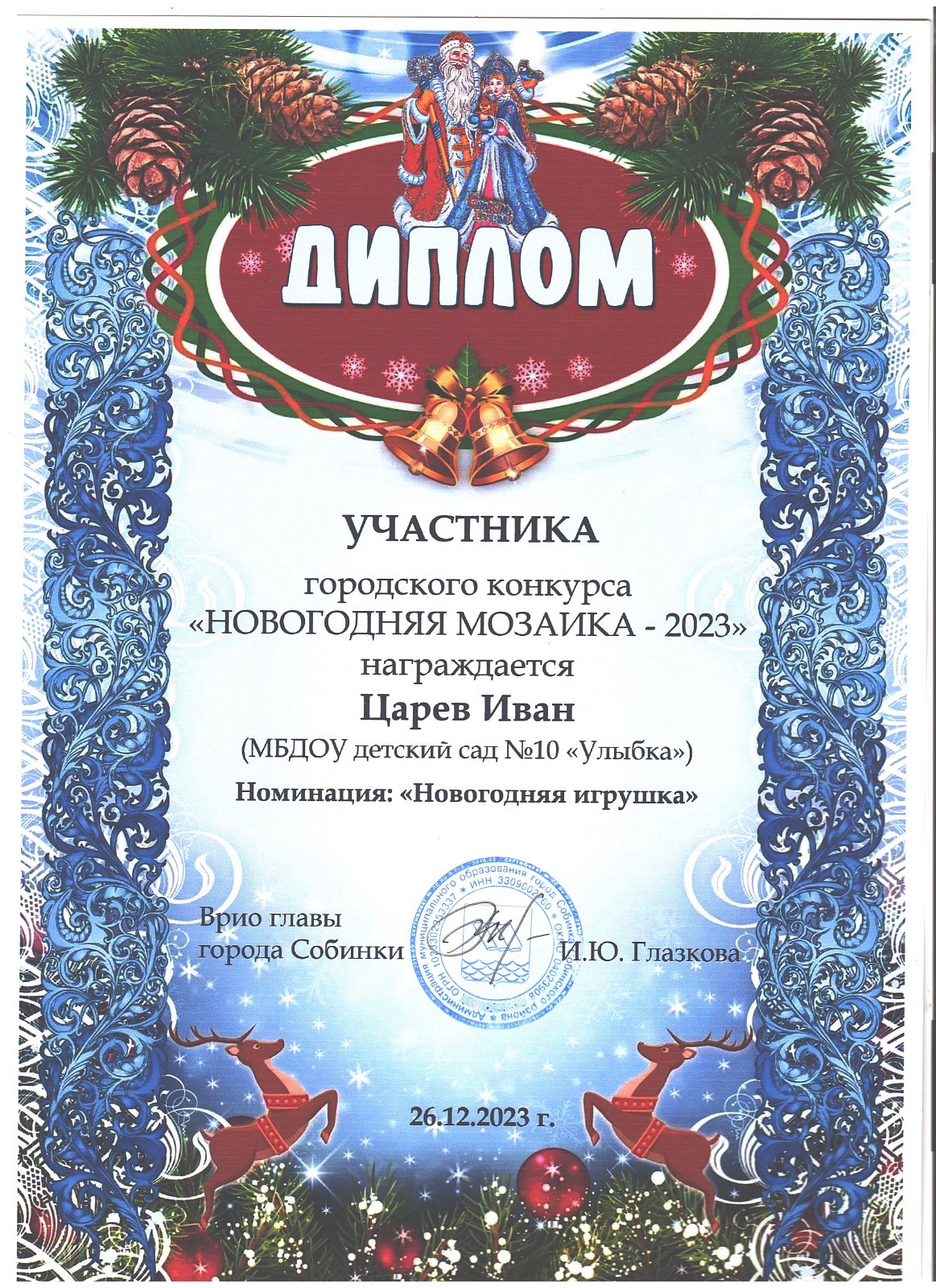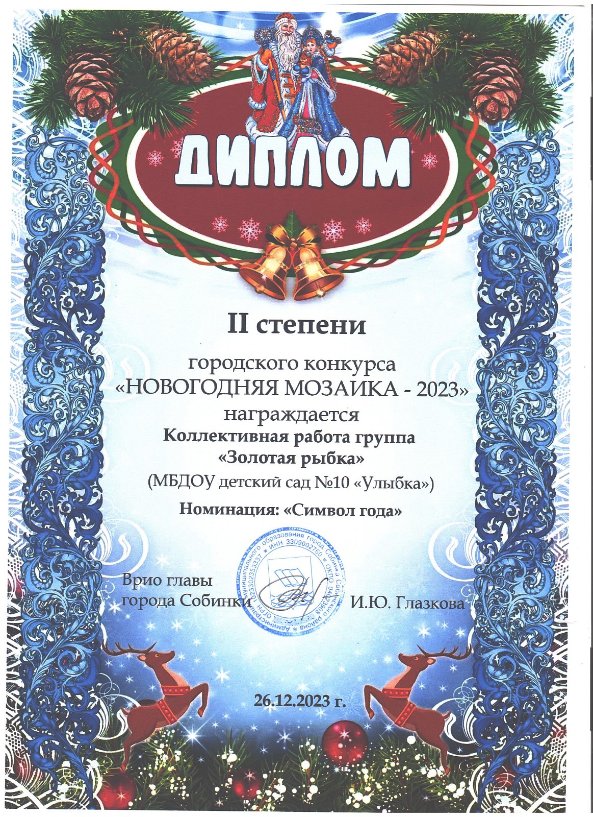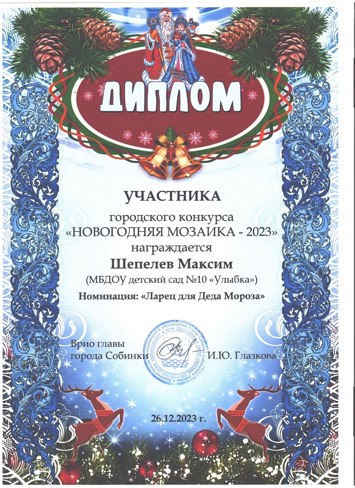| Золотая рыбка | Шепелев Максим | диплом участника в номинации "Ларец Деда Мороза" |