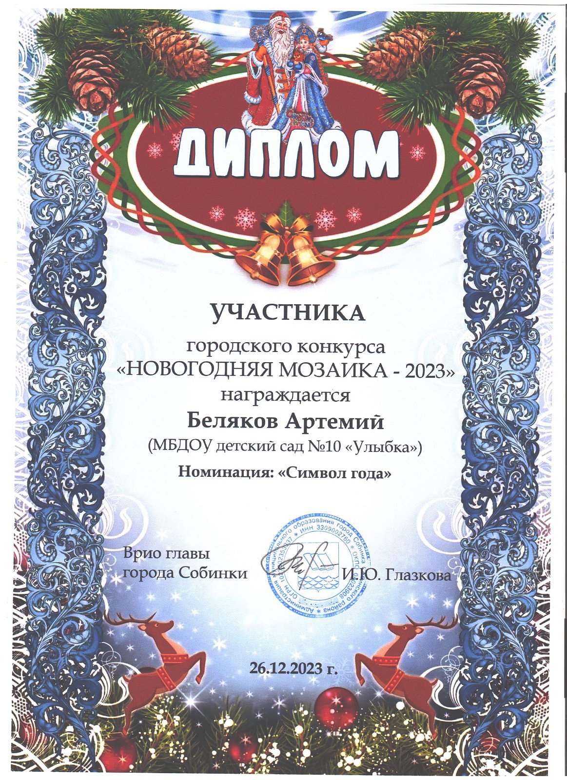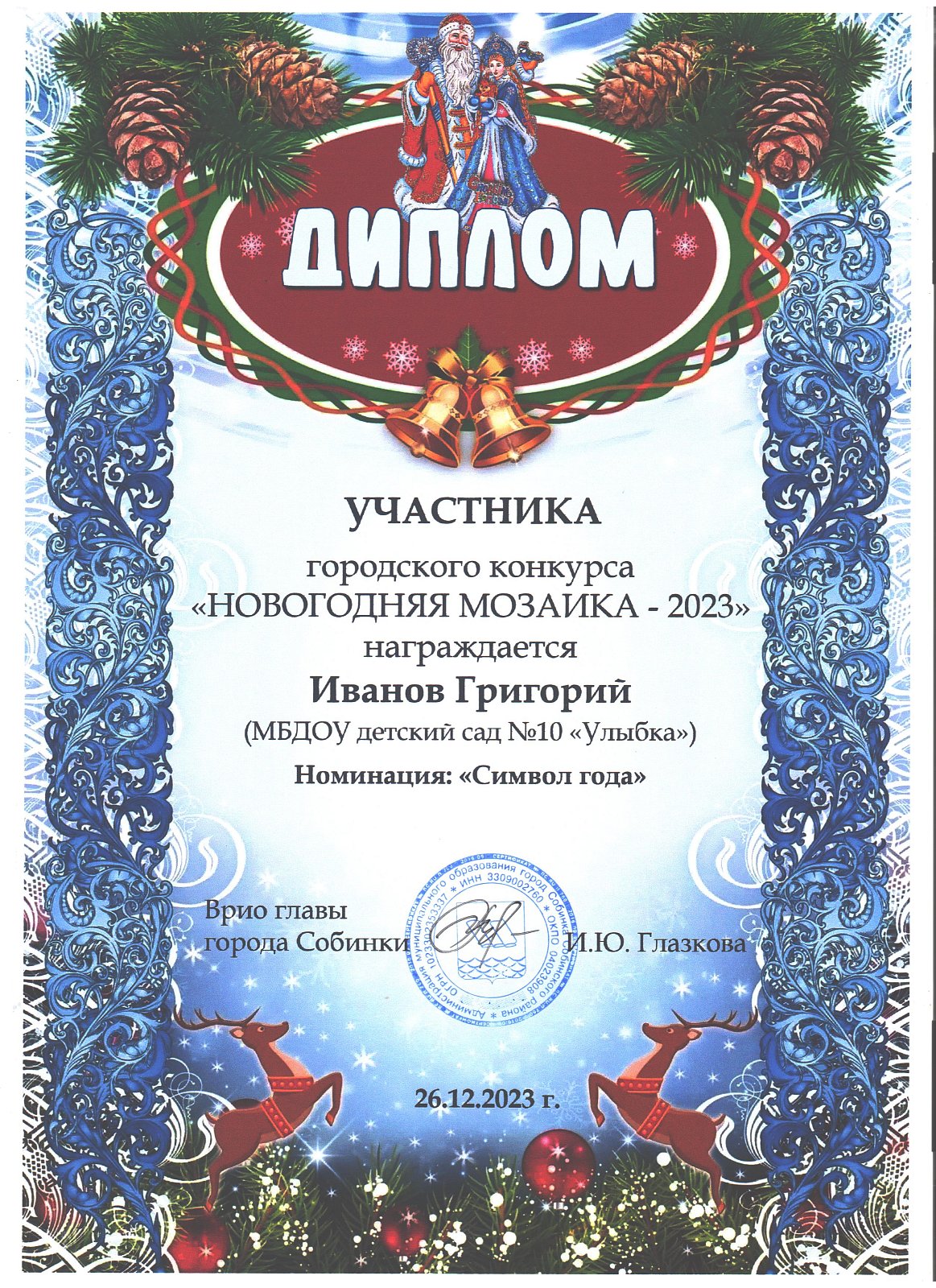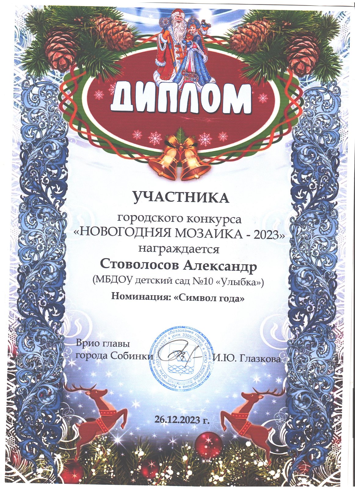 | Ладушки | Стоволосов Александр | диплом участника в номинации "Символ года" | Скуднова Т.Н. |