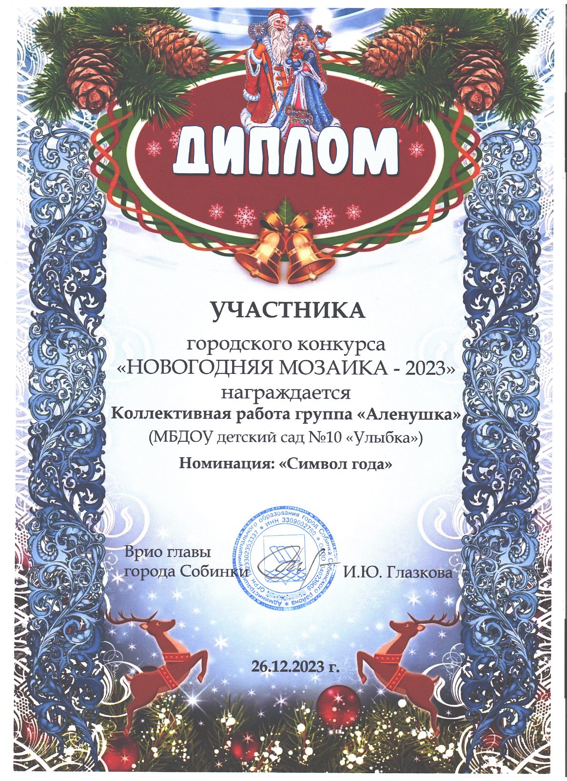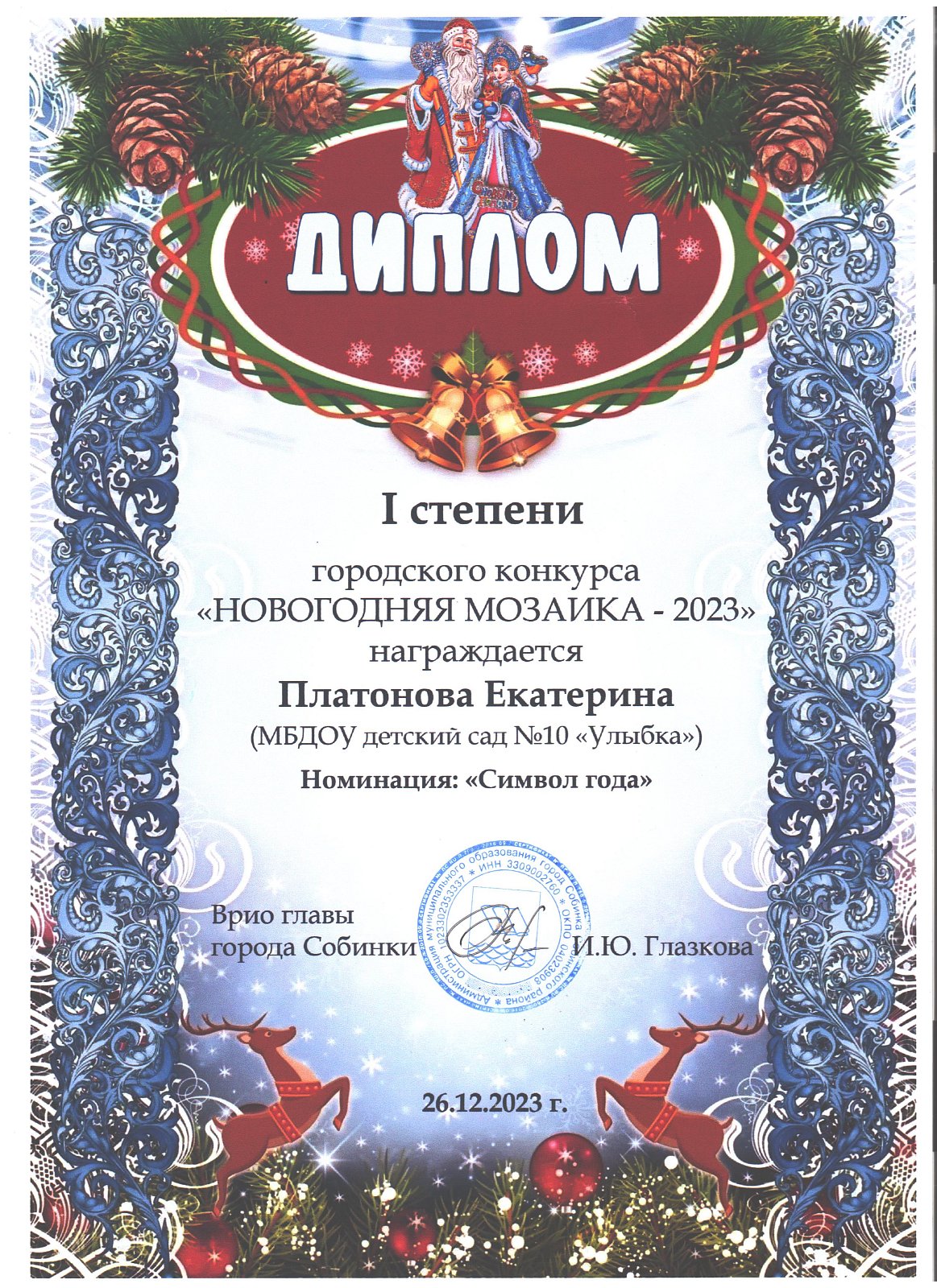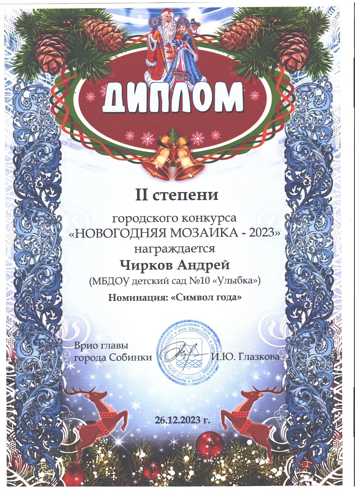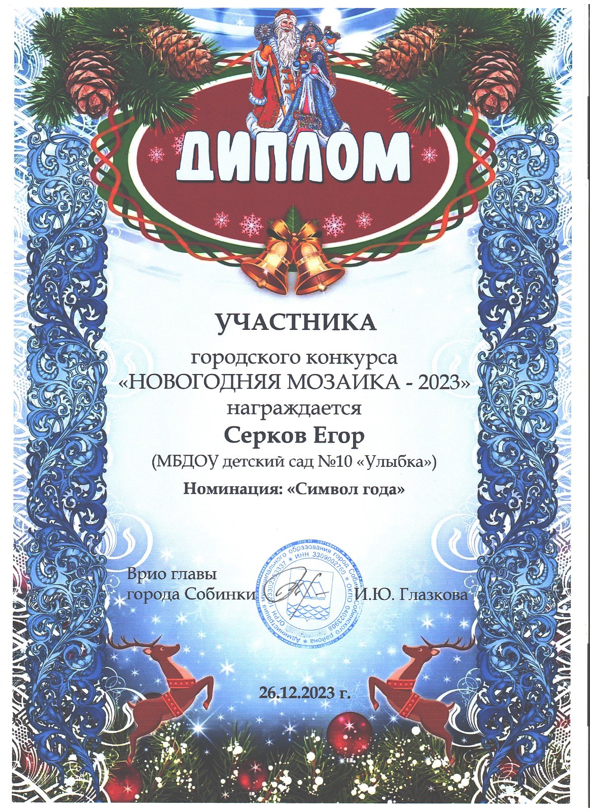 | Ладушки | Стоволосов Александр | диплом участника в номинации "Символ года" | Скуднова Т.Н. |
