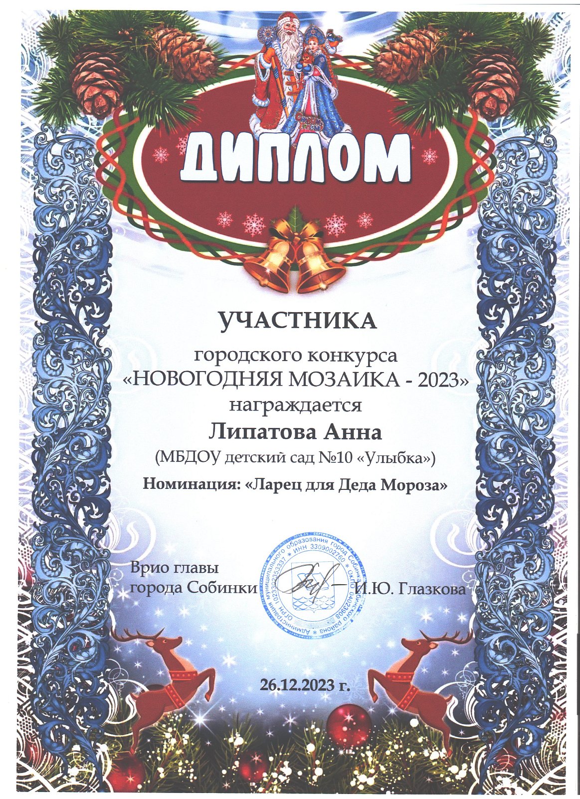 20. Липатова Анна номинация «Ларец для Деда Мороза», группа Солнышко