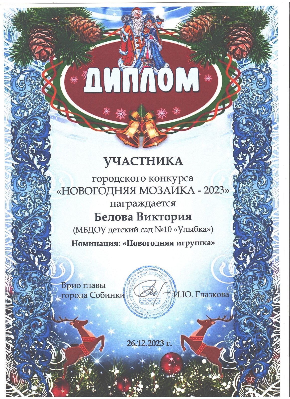 | Ладушки | Белова Виктория | диплом участника в номинации "Новогодняя игрушка" | Скуднова Т.Н. |