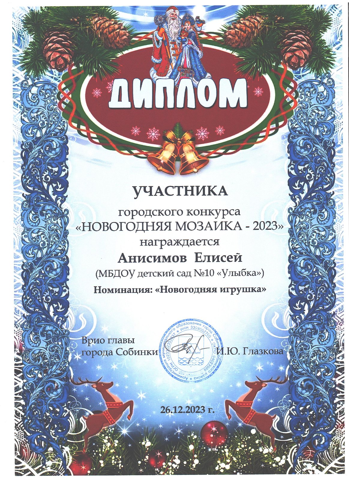 | Золотая рыбка | Анисимов Елисей | диплом участника в номинации "Новогодняя игрушка" |