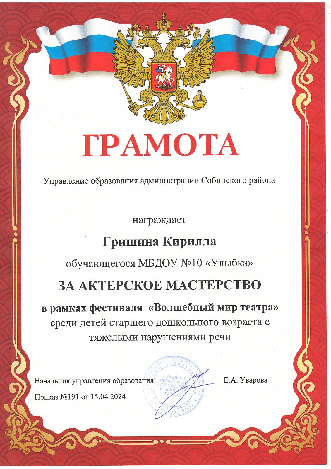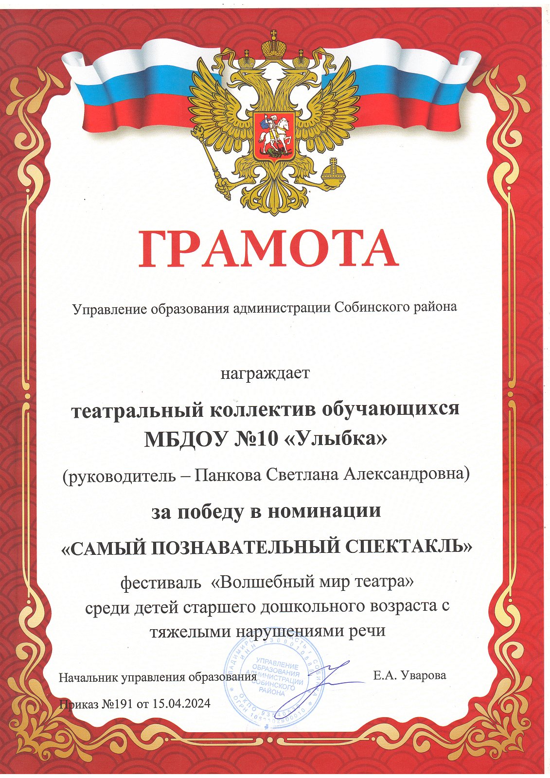В соответствии с приказом управления образования администрации Собинского района от 15.04.2024г. № 191 "Об итогах муниципального фестиваля театральных постановок среди детей с тяжелыми нарушениями речи" были награждены специальным дипломом по номинациям :