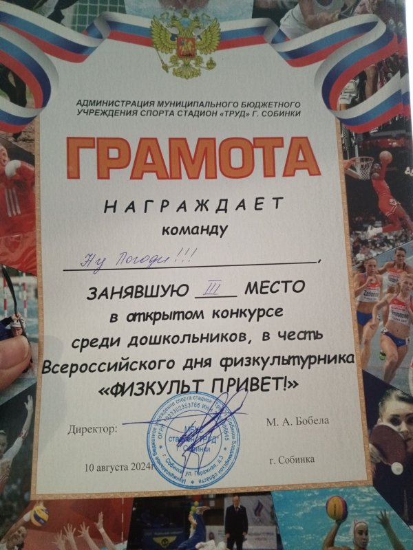 10 августа на городском стадионе "Труд" воспитанники детского сада в составе 8 человек, команда "Ну, погоди!" под руководством инструктора по физической культуре Челышковой В.А., с радостью приняли участие в спортивном конкурсе «Физкульт привет!». Где заняли почётное 3 место, между командами дошкольных учреждений города. Участникам соревнований достались не только призы, но и хорошее настроение!