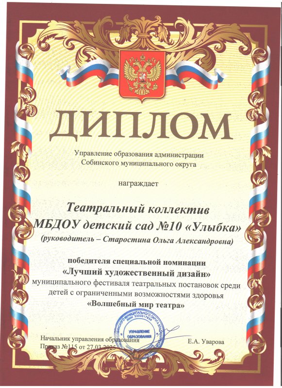 Театральному коллективу МБДОУ детский сад №10 "Улыбка" вручили грамоту победителя специальной номинации "Лучший художественный дизайн". Гришин Кирилл стал победителем специальной номинации "Лучший юный актер"