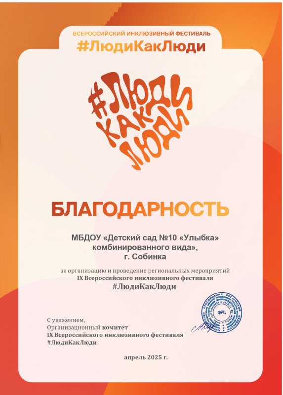 В среду 2 апреля на базе муниципального бюджетного дошкольного образовательного учреждения Собинского муниципального округа детский сад №10 «Улыбка» комбинированного вида прошли мероприятия региональной площадки Всероссийского инклюзивного фестиваля «Люди как люди».