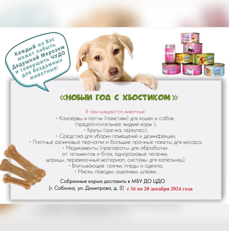Собранные корма, подстилки и т.д. доставить в МБУ ДО ЦДО (г. Собинка, ул. Димитрова, д. 3) с 16 по 20 декабря 2024 г. Ответственное лицо Копцева Алла Юрьевна (2-32-04).