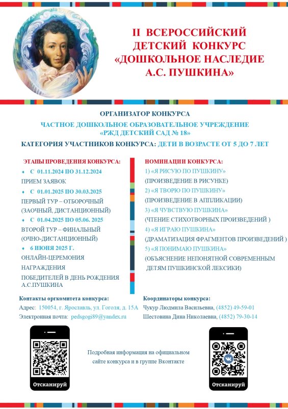 Второй тур – очный, финальный всероссийский (с 01 апреля по 05 июня 2025 года): очная онлайн викторина для дошкольников по творчеству А.С. Пушкина, определение победителей, призеров, дипломантов. Даты проведения онлайнвикторин по каждой номинации сообщаются дополнительно. Онлайн викторина проводится с использованием приложения Zoom. Для связи с наставниками участников второго этапа необходимо установление приложения Telegram на телефон или компьютер.
